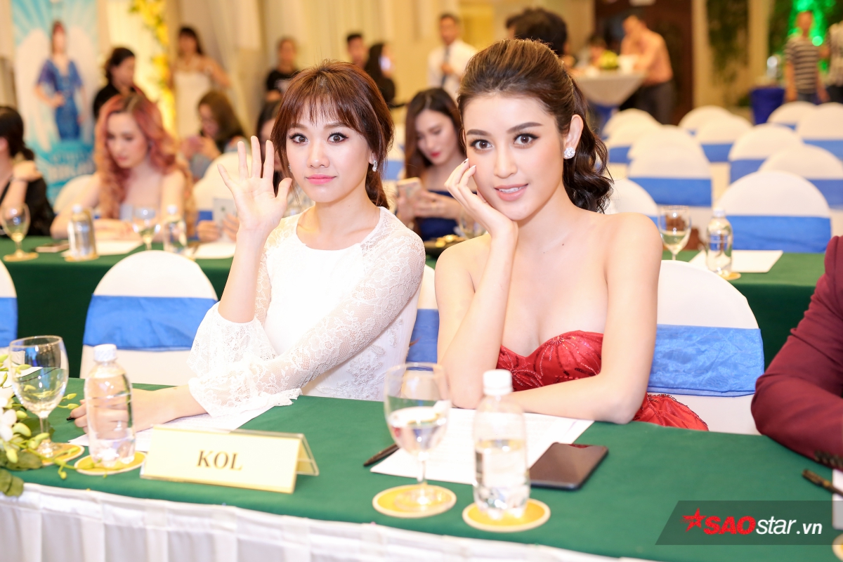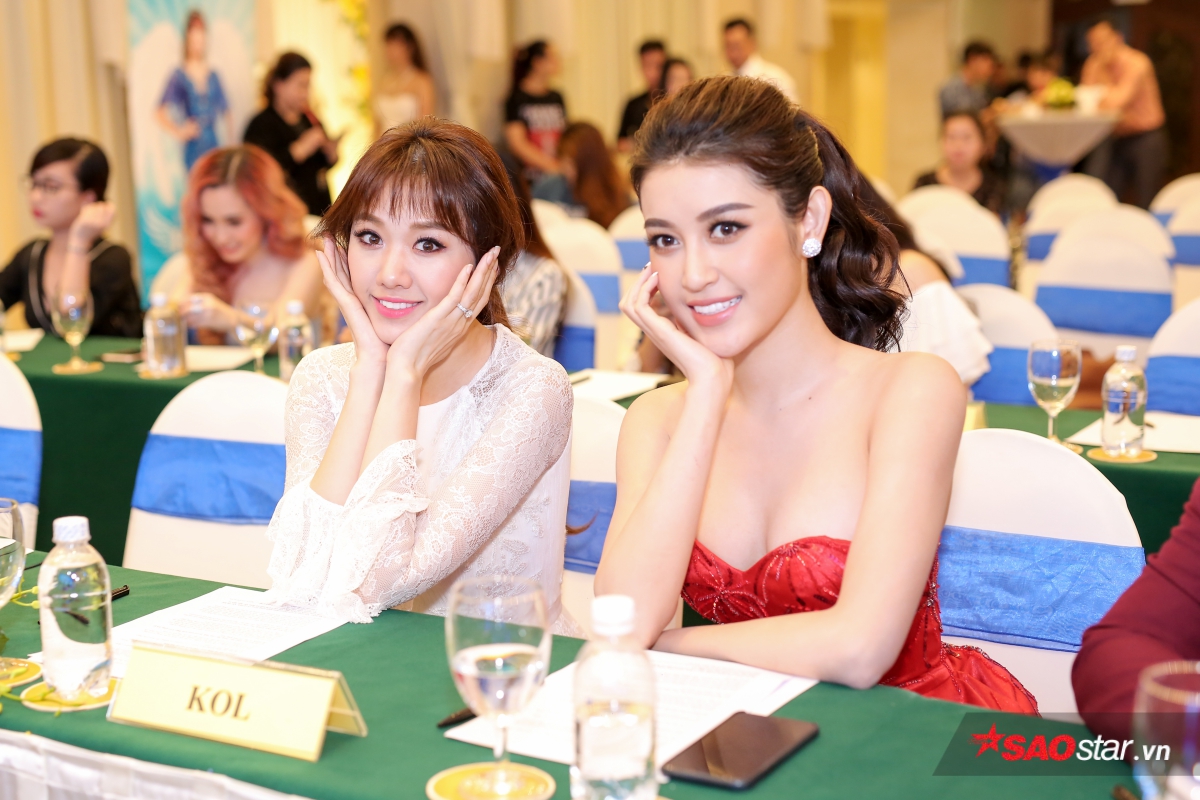 Biểu cảm đáng yêu của Hari Won và Huyền My tại buổi họp báo.