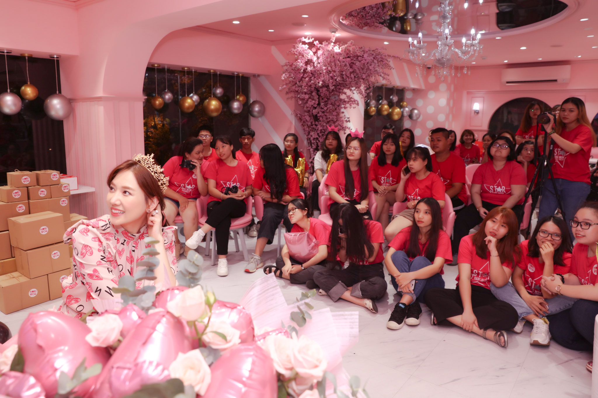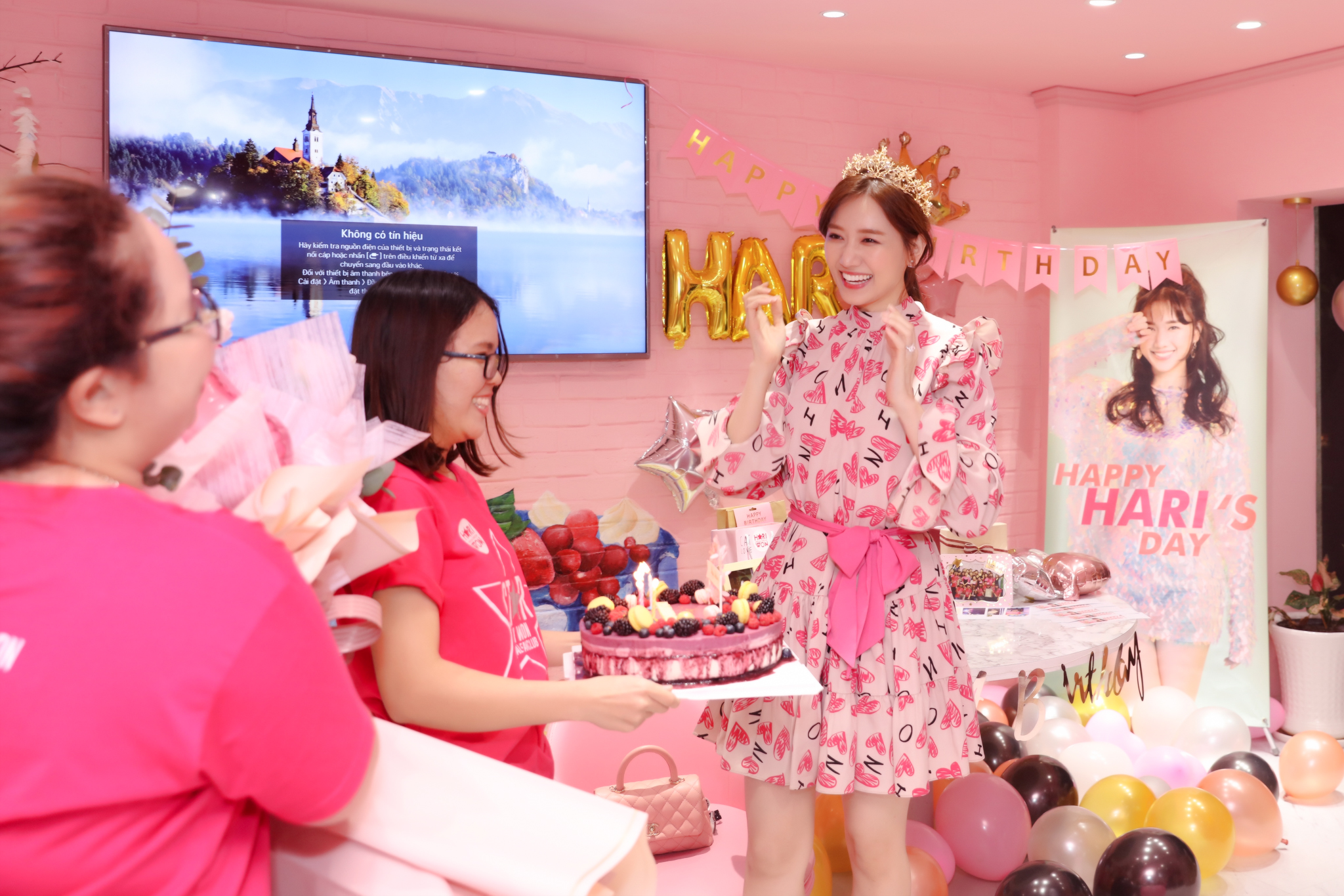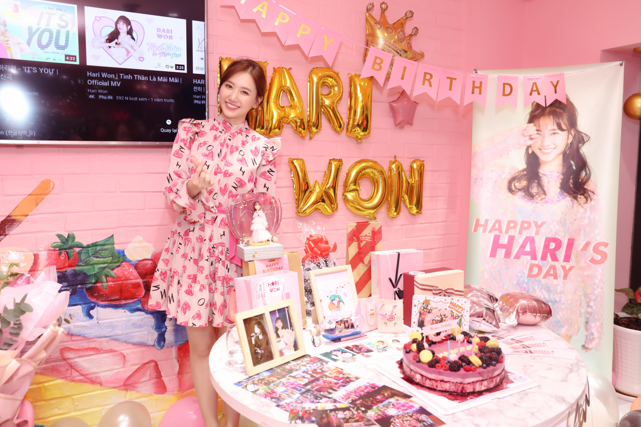 Tối 20/6, Hari Won được fan hâm mộ bất ngờ tổ chức buổi tiệc sinh nhật sớm tại TP.HCM. Màn chúc mừng sinh nhật bất ngờ này khiến nữ ca sĩ xúc động đến rơi nước mắt. Dù được chuẩn bị trong thời gian ngắn, FC của Hari Won vẫn dành sự chăm chút, tỉ mỉ cho không gian buổi tiệc. Với sắc hồng chủ đạo, căn phòng gồm nến, hoa, bóng bay và các bức ảnh kỷ niệm được treo khắp nơi.