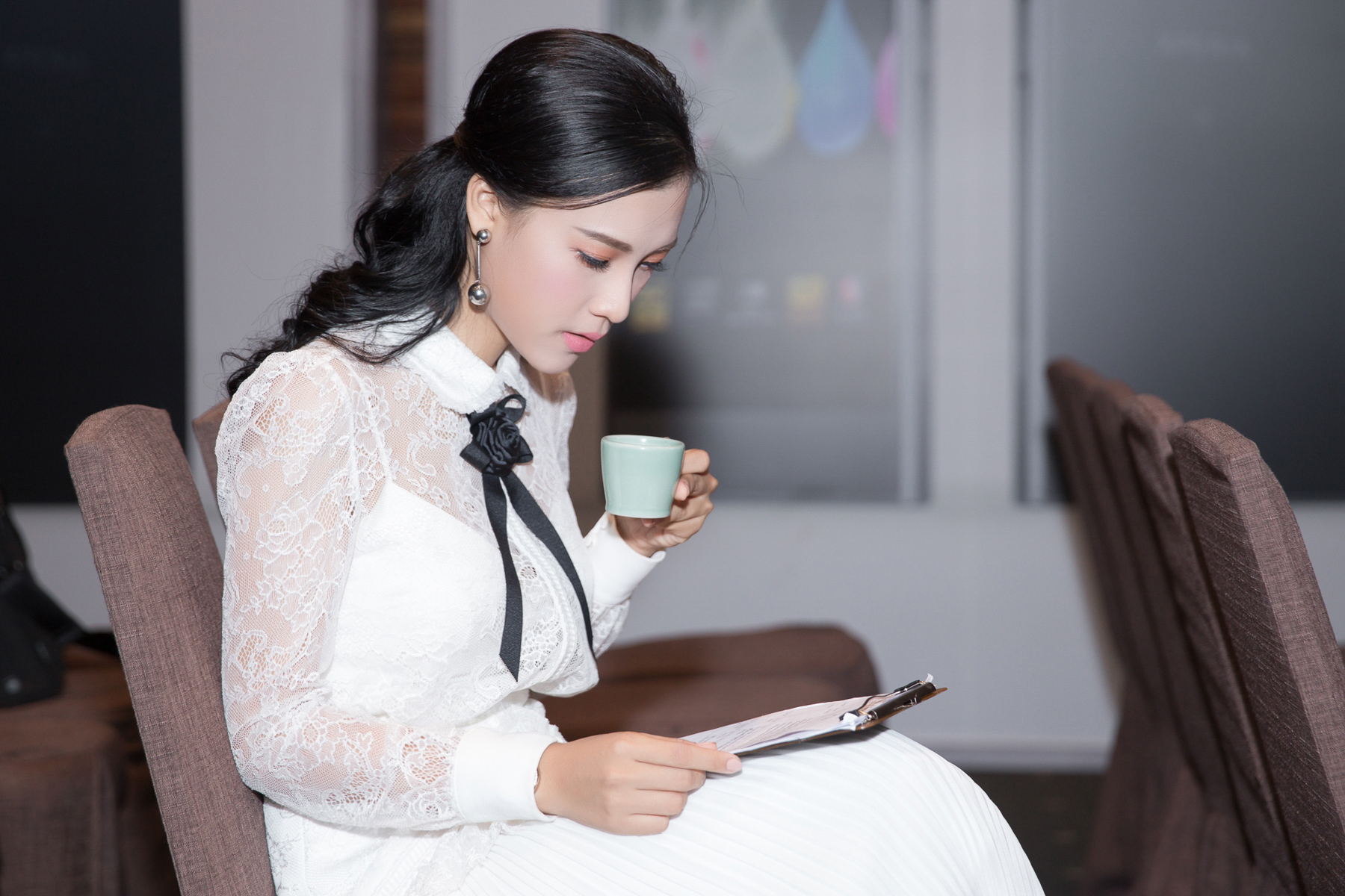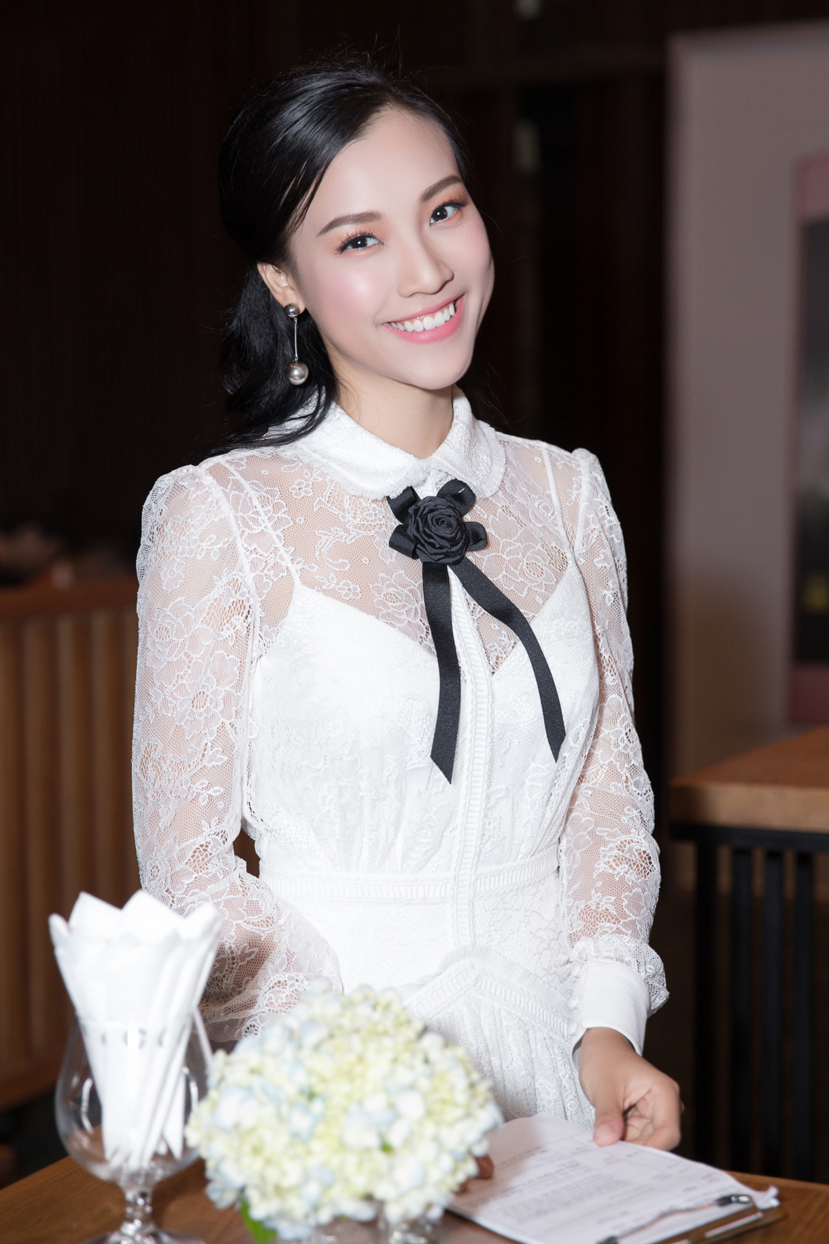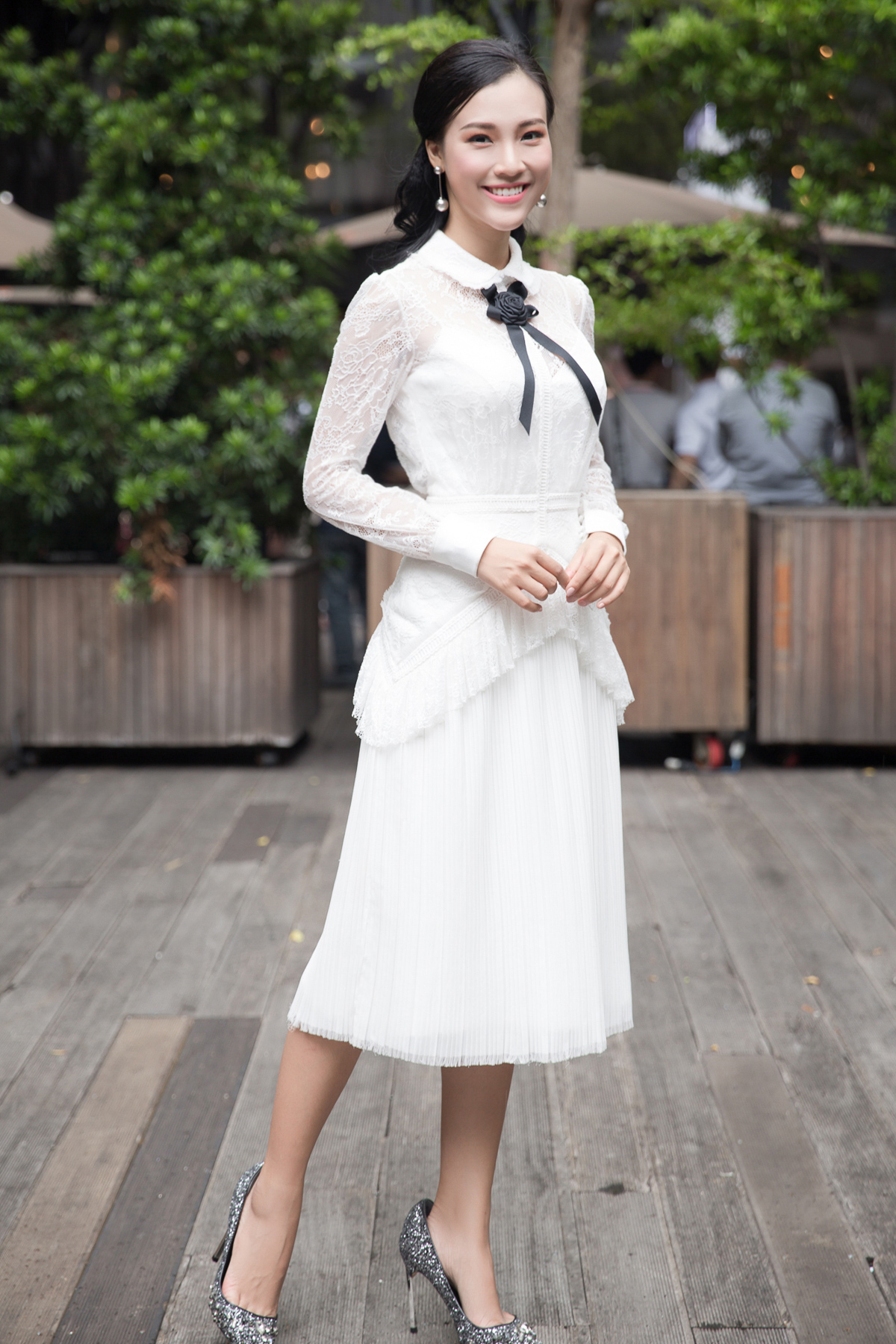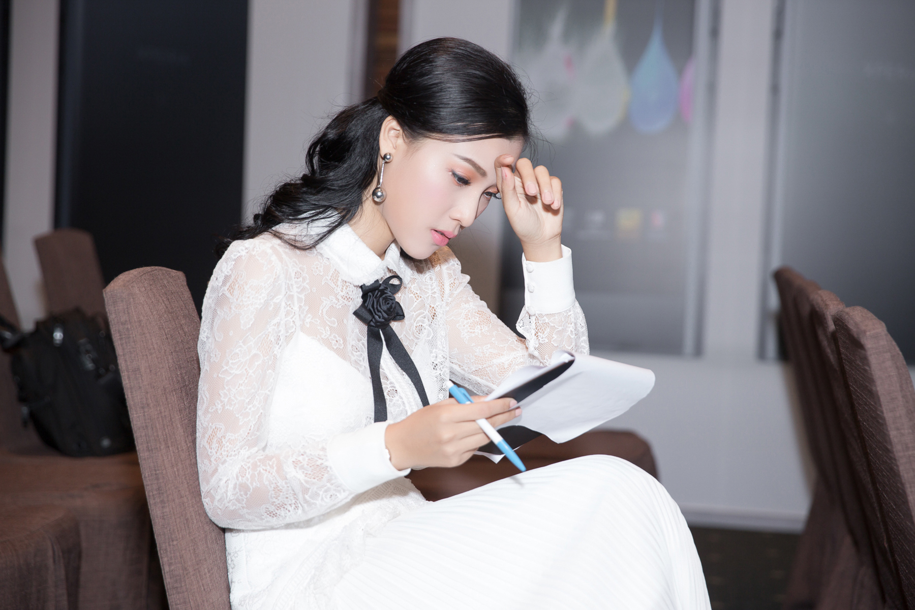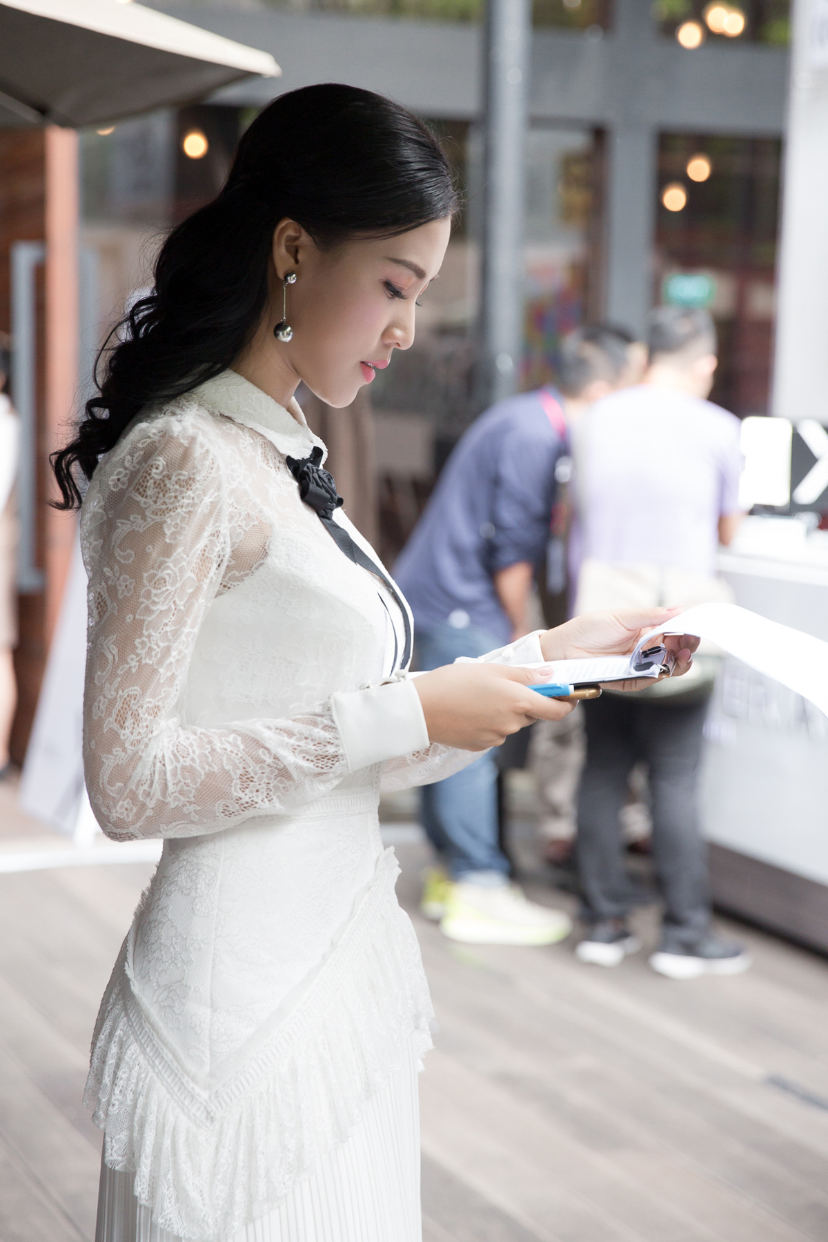 Nữ MC diện đầm ren trắng của NTK Châu Phạm, di chuyển từ một sự kiện khác đến để chuẩn bị.