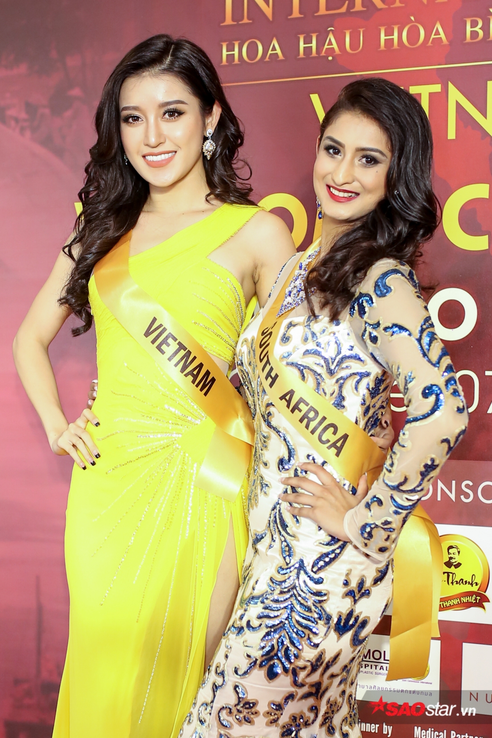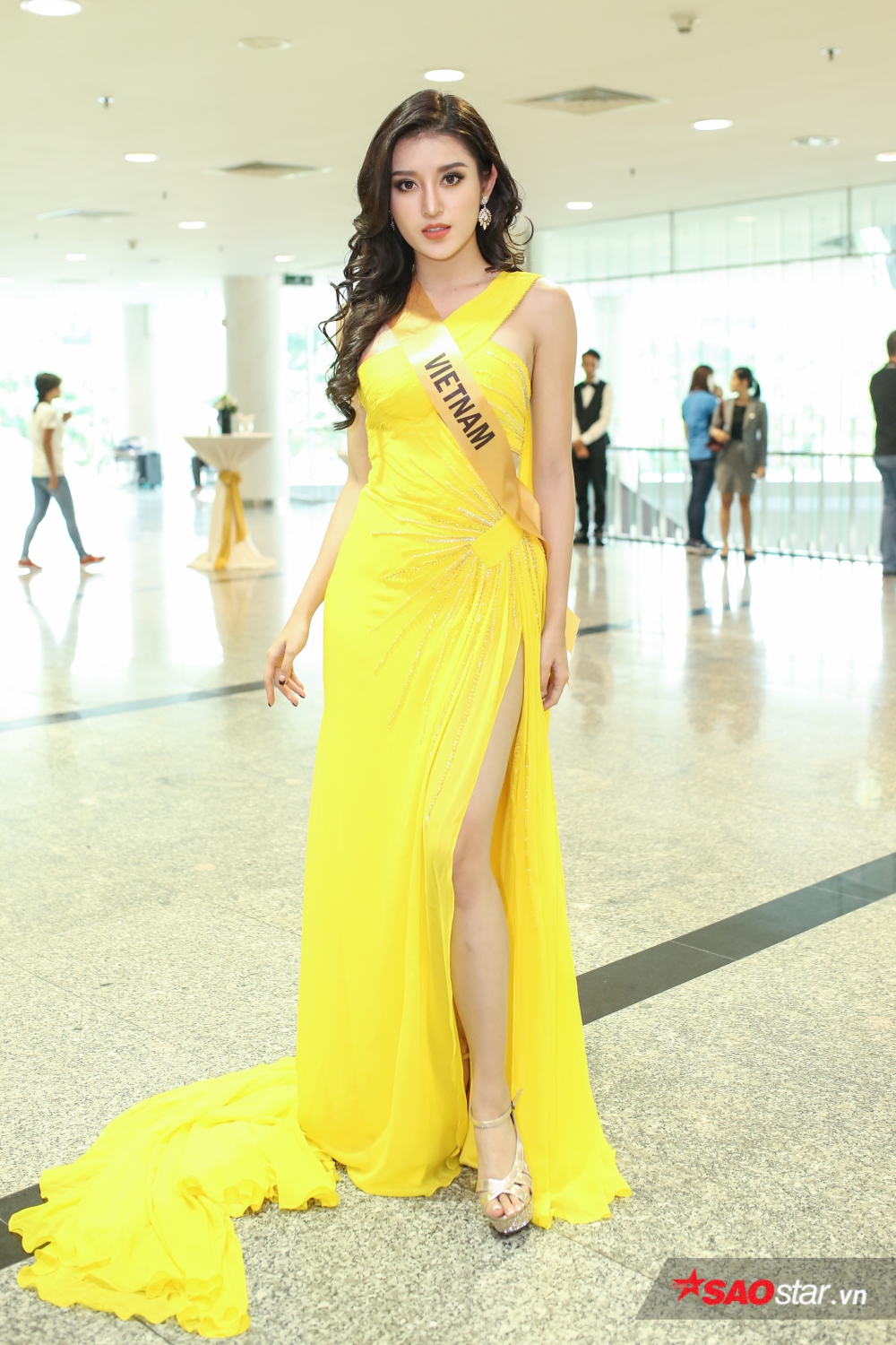Á hậu Huyền My xuất hiện rạng rỡ với bộ đầm dạ hội màu vàng thu hút mọi ống kính máy ảnh. Với tư cách là đại diện nước chủ nhà, người đẹp sinh năm 1995 luôn thân thiện với bạn bè quốc tế. Cô vui vẻ trò chuyện, chụp ảnh cùng dàn thí sinh tại Miss Grand International 2017.