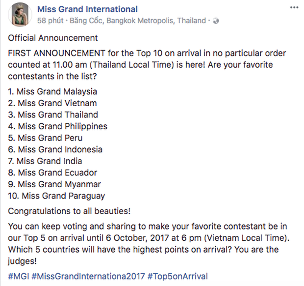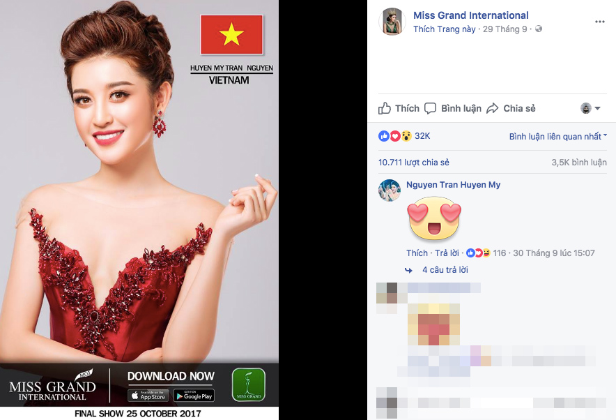 Mới đây, trang Facebook chính thức của Miss Grand International 2017 đã đăng tải danh sách Top 10 thí sinh được yêu thích nhất tính đến thời điểm hiện tại. Trong đó, người đẹp đến từ Việt Nam - Huyền My cũng xuất hiện trong danh sách này với vị trí thứ 2. Đây được xem là tín hiệu đáng mừng và rất nhiều hy vọng dành cho Huyền My tại Miss Grand International 2017.