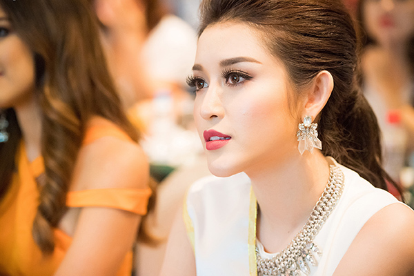 Á hậu gây chú ý khi góp mặt trong buổi họp báo với tư cách là thí sinh đại diện cho Việt Nam.