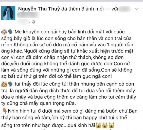 Cô viết: “Tôi thấy đôi lúc cũng tủi thân nhưng bên cạnh có con trai là người đàn ông đích thực để tôi dựa vào rồi thêm mấy đứa em nhây cộng thêm cộng việc càng làm cho tôi cảm thấy tình yêu cũng chả mấy quan trọng nữa”. Nữ ca sĩ nhấn mạnh thêm, ai đó có thể sống vô tâm, ích kỷ mà vẫn hạnh phúc chứ cô không thể trơ trẽn như vậy.