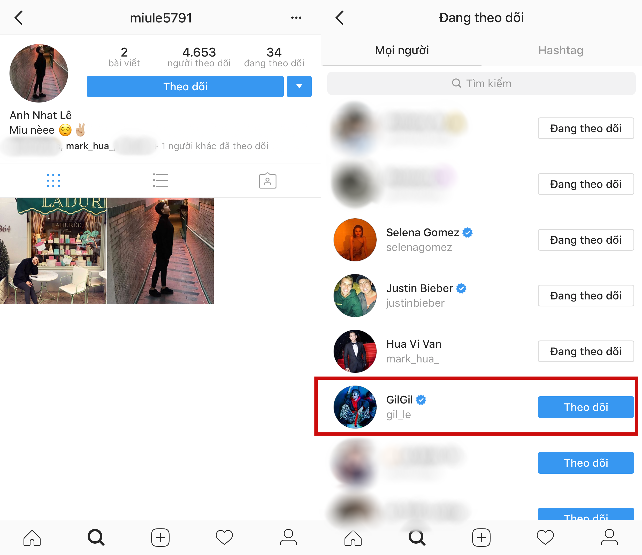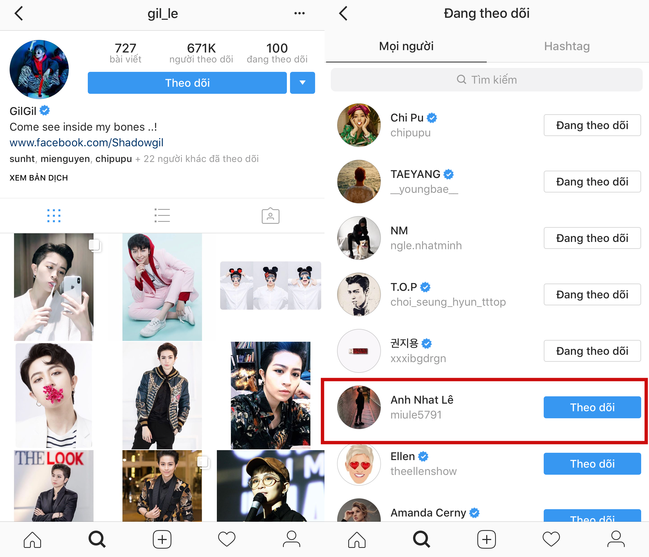 Cách đây ít ngày, Gil - Miu Lê cũng bị fan phát hiện bắt đầu theo dõi nhau dù trước đó cả hai không hề có tương tác trên mạng xã hội Instagram.