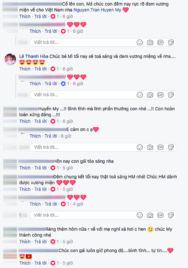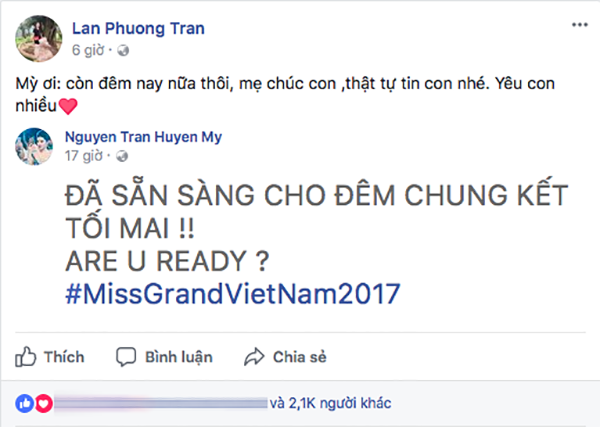 Mới đây, trên trang cá nhân, bà Trần Lan Phương - mẹ của Á hậu Huyền My đã có những dòng chia sẻ nhằm cổ vũ và động viên tinh thần con gái trước giờ G. Bà viết: “Mỳ ơi: còn đêm nay nữa thôi, mẹ chúc con thật tự tin con nhé. Yêu con nhiều!”.