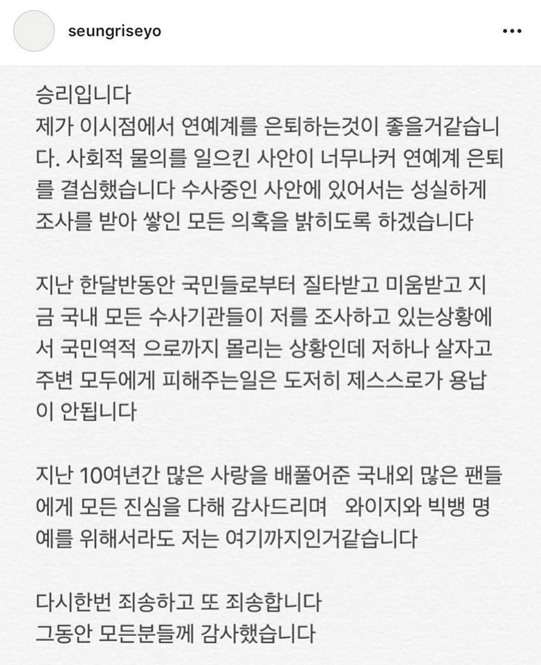 Sau khi công bố giải nghệ, rút khỏi BigBang để bảo toàn danh tiếng cho nhóm và đại gia đình YG, vụ bê bối mại dâm và ma tuý của anh chàng chính thức được mở rộng sang quy mô cấp xã hội khi Quốc hội Hàn Quốc chính thức nhập cuộc điều tra. Mới đây, Thủ Tướng nước này đã có phát biểu trực tiếp trước Quốc hội và công dân Hàn: “Từ vụ hành hung ở một hộp đêm tại Gangnam, một loạt bê bối từ buôn bán ma túy, cưỡng hiếp, ăn hối lộ giữa chủ sở hữu và cảnh sát đã bị phanh phui. Tôi mong rằng cảnh sát hãy coi đây là một sự xúc phạm đến danh dự của chính mình để có thể bắt tay vào điều tra kỹ lưỡng toàn bộ những hành vi phi pháp. Tôi hy vọng các điều tra viên sẽ ghi nhớ trong đầu rằng chuyện gì sẽ xảy ra nếu chúng ta không giải quyết triệt để những mối nghi ngờ liên quan đến các hoạt động bất hợp pháp, để có thể dốc hết sức mình mà điều tra”.