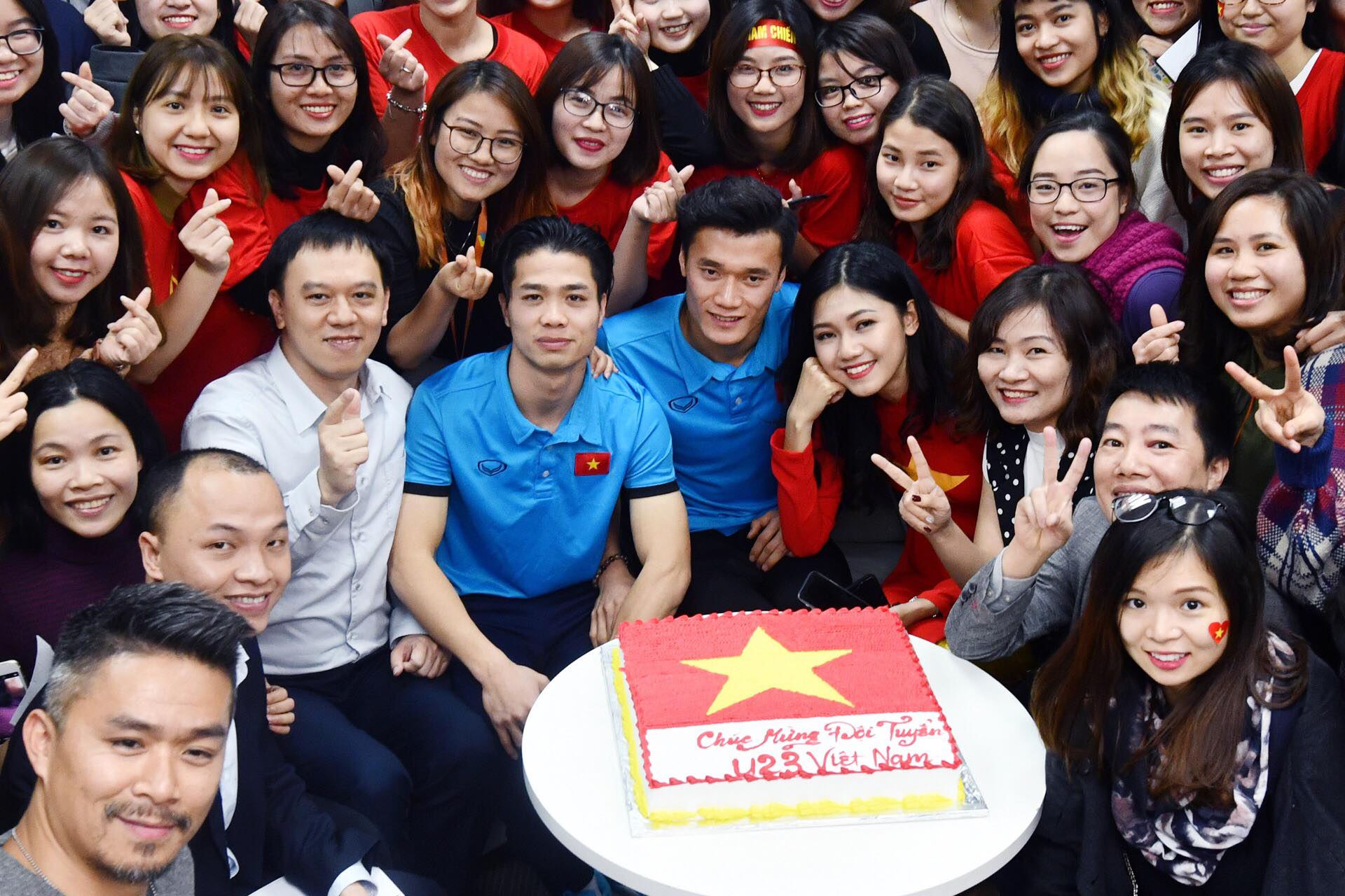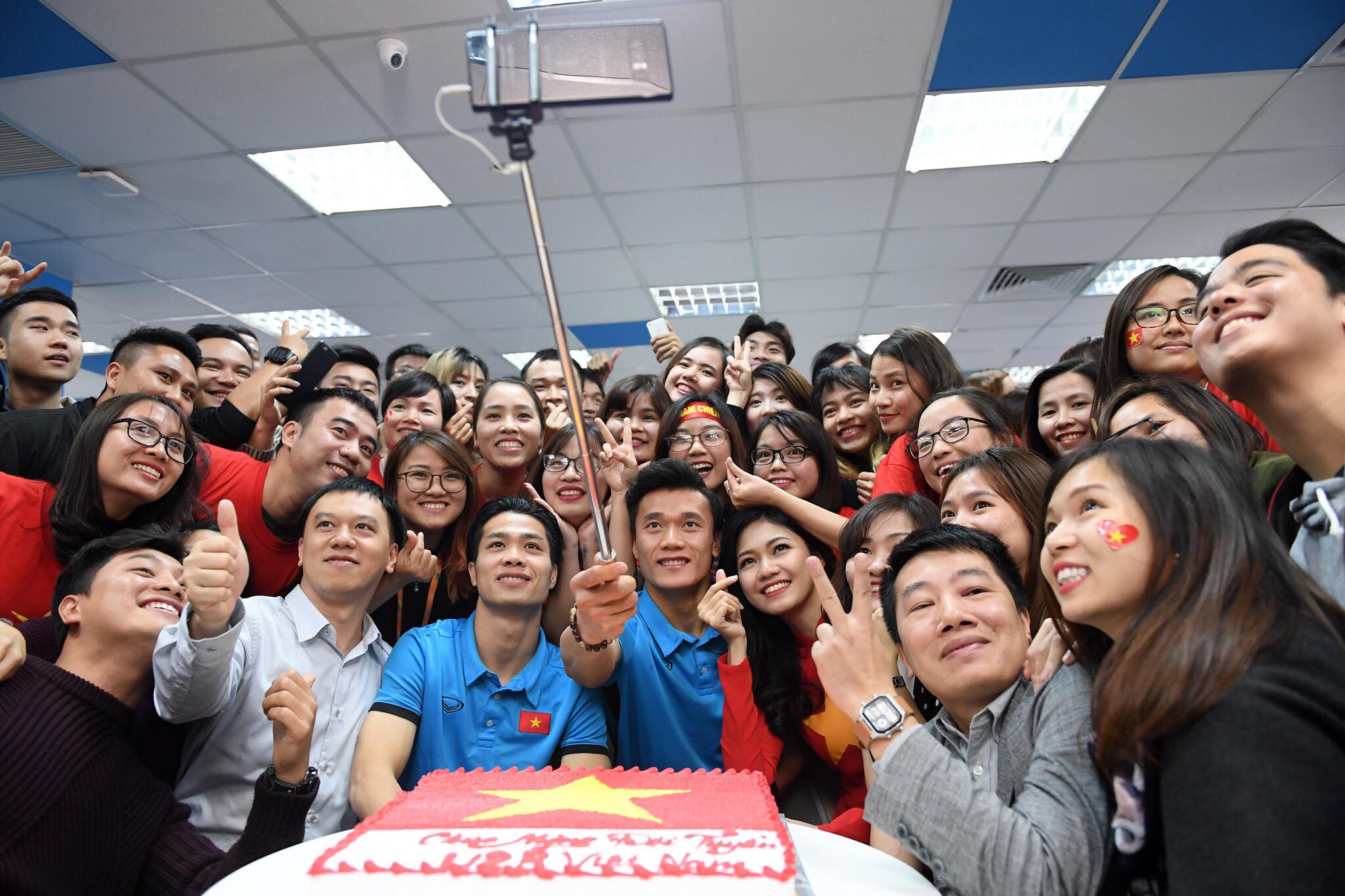 Nam thủ môn sinh năm 1997 vui vẻ chụp ảnh tự sướng cùng Công Phượng, Thanh Tú và người hâm mộ.
