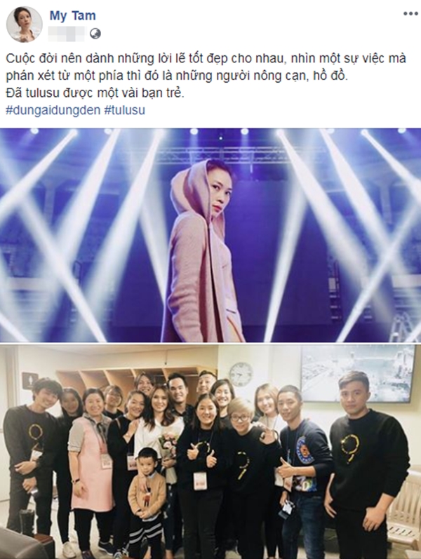 Sau những chia sẻ thẳng thắn, mới đây Mỹ Tâm tiếp tục đăng một bức ảnh chụp cùng những người bạn và chia sẻ: “Cuộc đời nên dành những lời lẽ tốt đẹp cho nhau, nhìn một sự việc mà phán xét từ một phía thì đó là những người nông cạn, hồ đồ“. Với dòng hashtag #dungaidungden, có thể ngầm hiểu cô nàng vẫn đang nói về vấn đề trên và mong muốn mọi việc dừng lại vì Tâm sẽ bảo vệ những người mình yêu quý đến cùng.