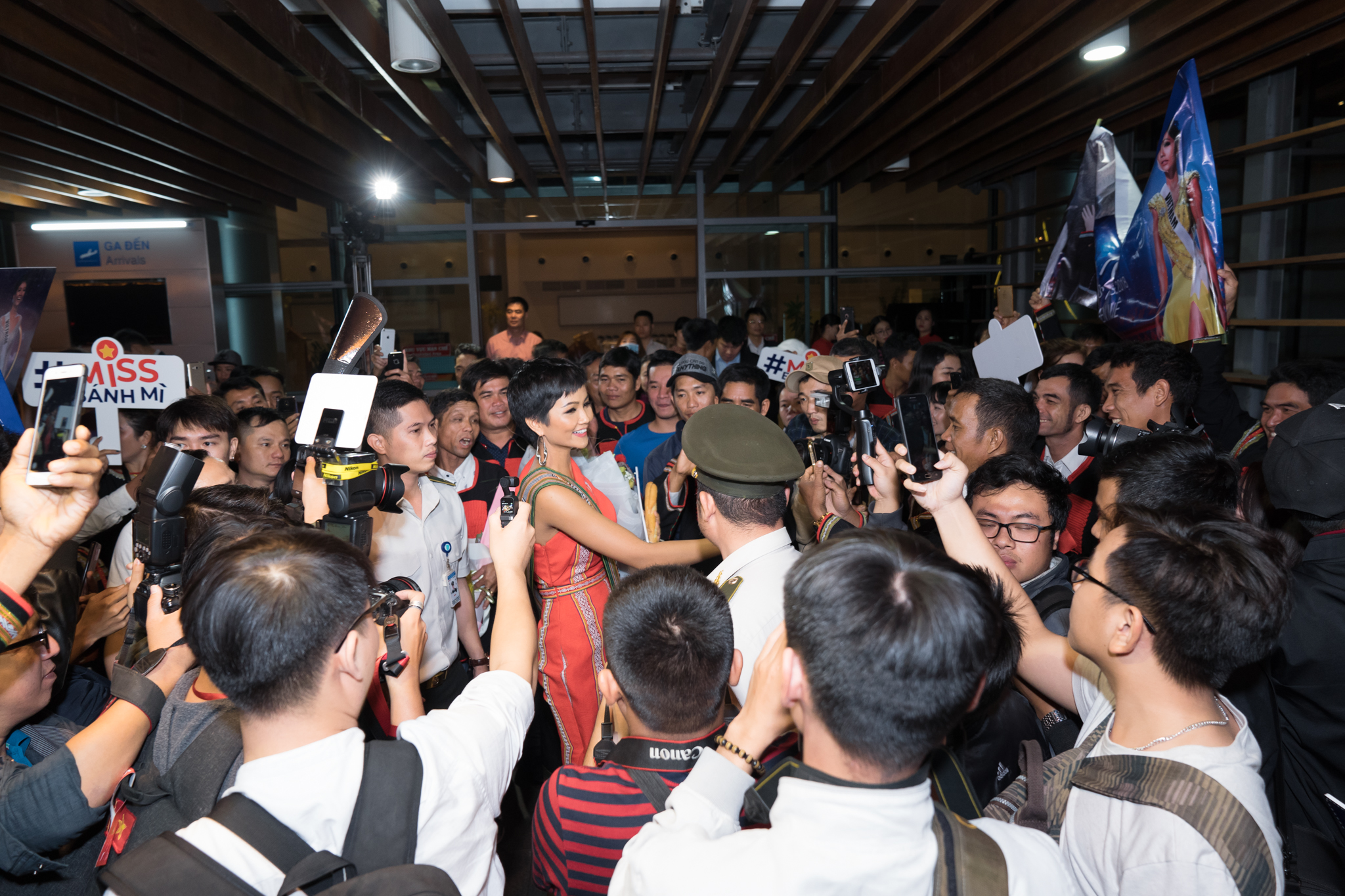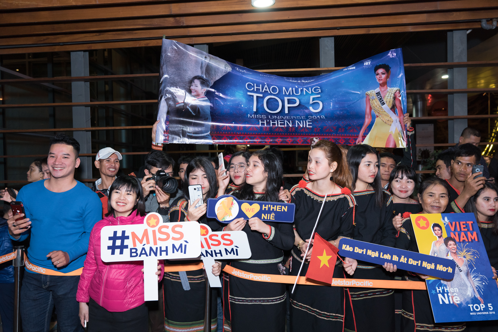 Mặc dù thời tiết khá lạnh nhưng rất đông khán giả đã có mặt ở sân bay Buôn Ma Thuột từ sớm để chào đón H’Hen Niê. Xuất hiện với nụ cười tươi rạng rỡ cùng bộ trang phục màu đỏ cách điệu họa tiết Êđê, H’Hen Niê không giấu được sự xúc động trước sự chào đón của mọi người.