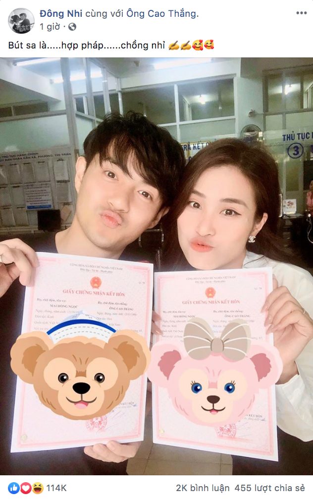 Có thể nói, ngoài đám cưới thì giấy kết hôn cũng là một vật đặc biệt thiêng liêng chứng nhận sự hợp pháp của một cặp vợ chồng theo pháp luật. Chính vì vậy, chỉ sau 1 giờ đăng tải, bài viết của Đông Nhi thu hút hơn 112 ngàn lượt thích và hàng ngàn bình luận từ khán giả.