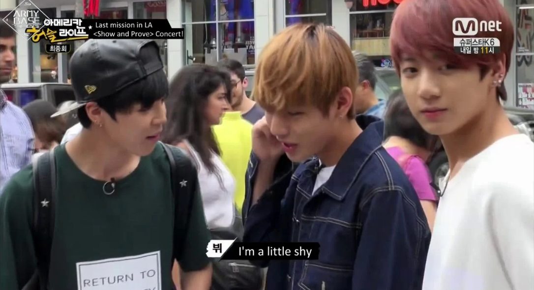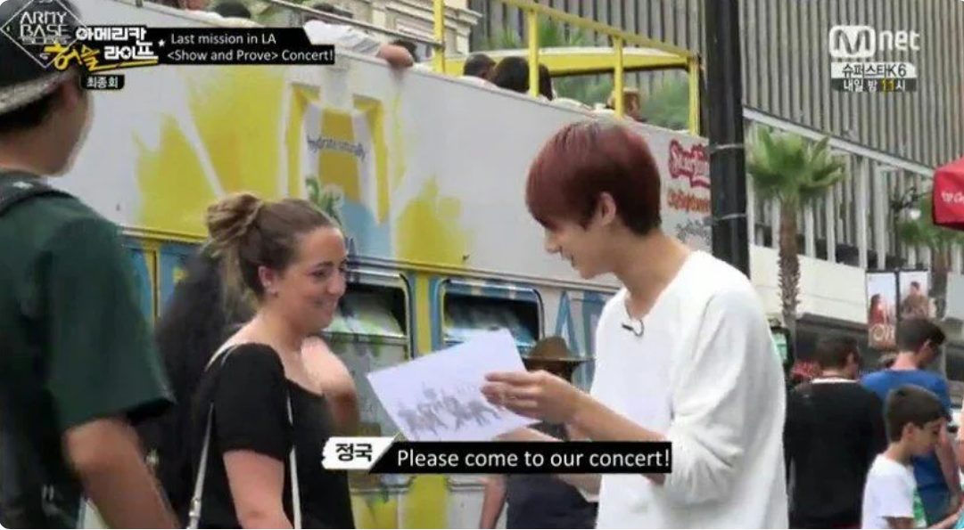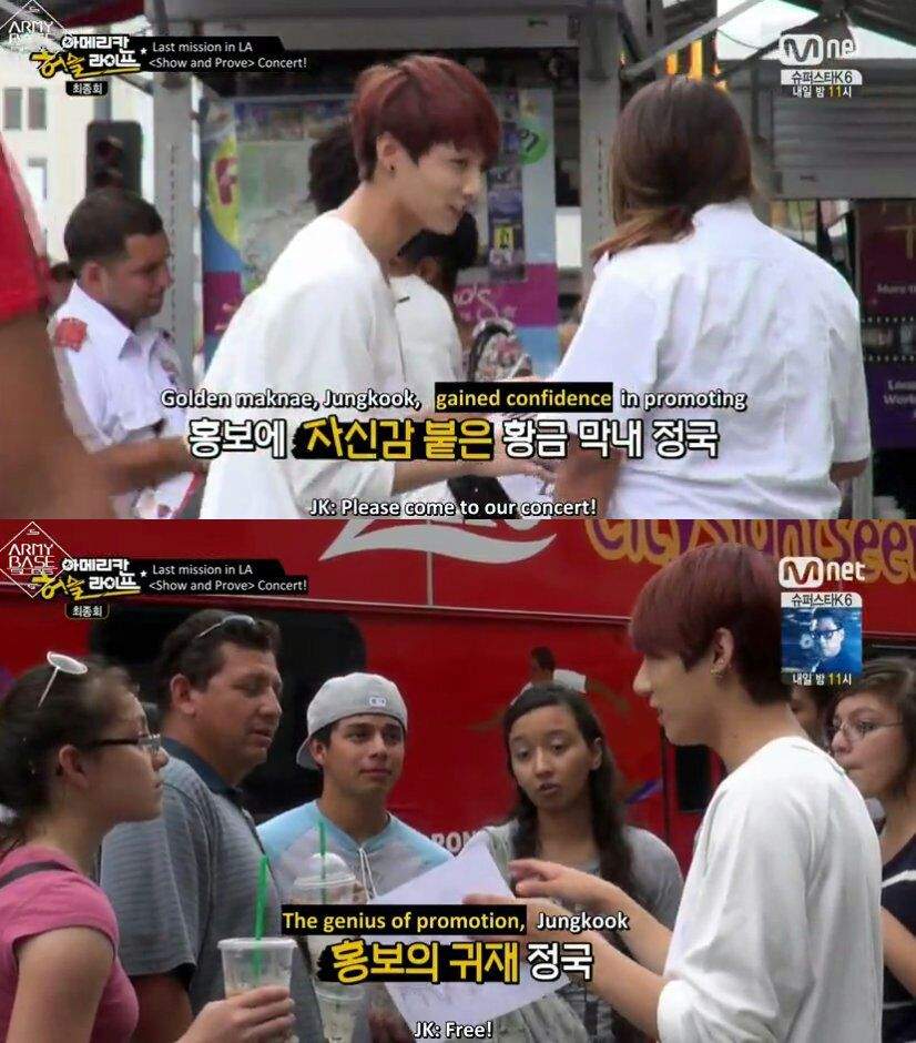Hơn thế chắc có lẽ khán giả vẫn còn khá nhiều ấn tượng trong tập cuối của chương trình thực tế “American Hustle Life” - nơi BTS đã đi du lịch đến Mỹ để tìm hiểu thêm về văn hóa hip hop. Nhiệm vụ cuối cùng của những chàng trai này liên quan đến việc họ phải phát tờ rơi trên Đại lộ Hollywood và mời những người qua đường ngẫu nhiên đến tham dự buổi hòa nhạc miễn phí của mình. Với số lượng khoảng 200 tờ rơi, Jimin đã khôn khéo vạch ra cho nhóm thành 2 chiến lược: Một là khăng khăng tìm ai đó đến buổi hòa nhạc của mình bằng cách nói với họ “Come on man” trong khi người còn lại sẽ nói với những người qua đường rằng: “I want you to come see my concert”.