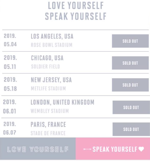Trải qua nghìn trùng khó khăn, với những hành động cũng như sự ủng hộ từ người hâm mộ cũng nên xem là một ví dụ cho thấy BTS đã đi được bao xa. Chỉ từ một buổi hòa nhạc miễn phí tại Los Angeles bằng cách phát rất nhiều tờ rơi để mời gọi mọi người tham gia cho đến việc trở thành nhóm nhạc Kpop đứng đầu Billboard 200 ba lần trong một năm, giành giải thưởng tại AMAs và BBMA cũng như hợp tác với nhiều nghệ sĩ nổi tiếng, hàng đầu thế giới như Nicki Minaj, Ed Sheeran và Halsey. Đối với tour diễn vòng quanh thế giới “Love Yourself: Speak Yourself”, BTS chắc chắn sẽ không tổ chức bất kỳ buổi hòa nhạc miễn phí nào nữa! Tất cả các buổi hòa nhạc của họ trong chuyến lưu diễn vé đã được bán hết.