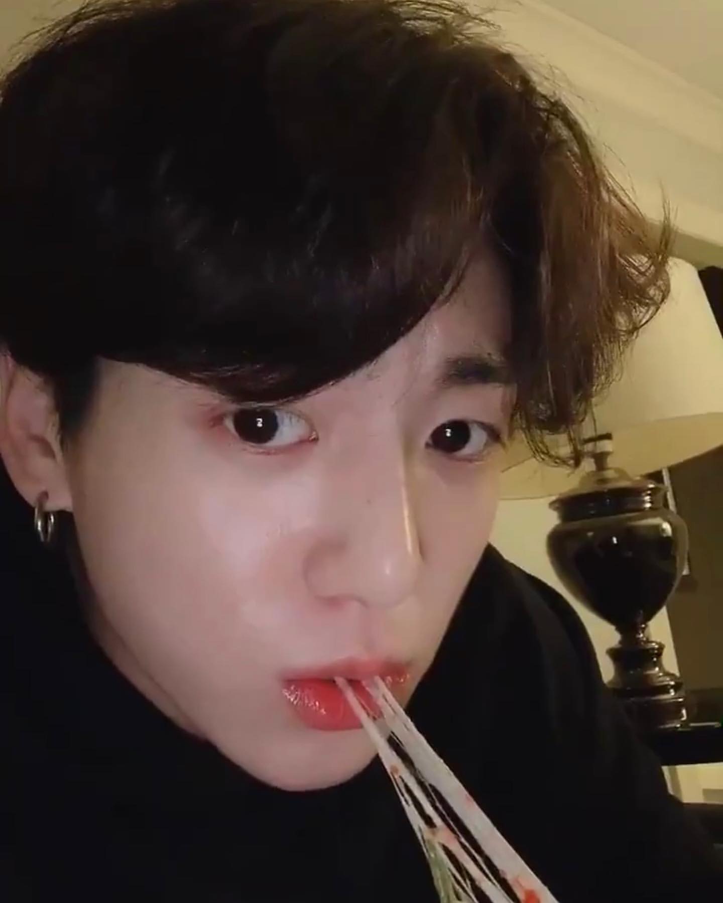 Sau khi cắn một miếng thật to, một loạt biểu cảm hết sức dễ thương của chàng nam thần Jungkook liền hiện ra trên gương mặt “xinh như hoa” của mình. Đôi mắt của anh mở to ra hết nấc, đôi môi đỏ mọng đang cố thưởng thức miếng phô mai không bao chịu đứt ra khiến Jungkook phải bất lực đến “bó tay”. Không chỉ vậy, fan còn đứng ngồi không yên với biểu cảm ngơ ngác trên khuôn mặt của Jungkook, thậm chí nhiều người nghĩ rằng anh chàng rất giống đang quảng cáo pizza thuyết phục với miếng phô mai vẫn còn dính đầy trong miệng của mình.