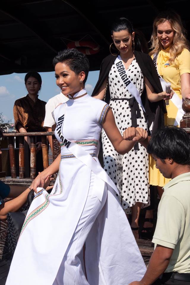 H’Hen Niê đã diện một chiếc áo dài cách tân kín đáo do NTK Linh San chuẩn bị cho cô. Đây cũng là một trong những điểm tinh ý của đại diện Việt Nam khi lựa chọn trang phục. Những ngày bình thường cô luôn lựa chọn các bộ trang phục khỏe khoắn. Thế nhưng khi tham gia những hoạt động thăm thú này, H’Hen Niê lại lựa chọn 1 bộ đồ đậm bản sắc dân tộc cũng như kín đáo như vậy.
