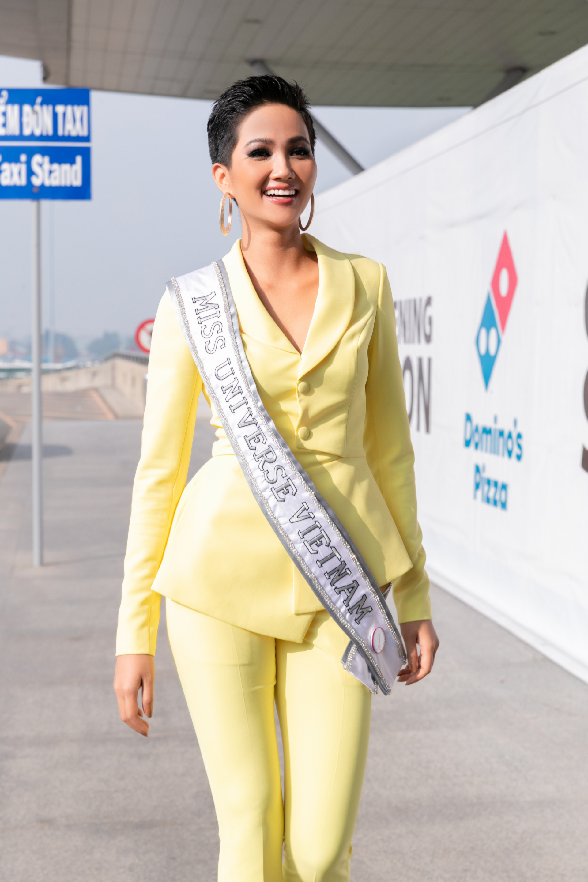 Thời điểm H'Hen Niê lên đường sang Thái Lan, cô cũng lựa cọn 1 bộ suit vàng rực.