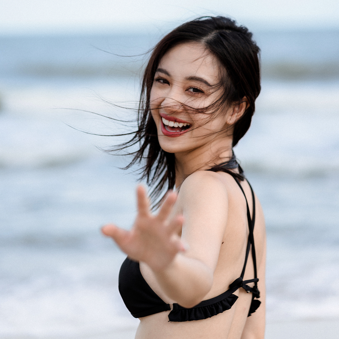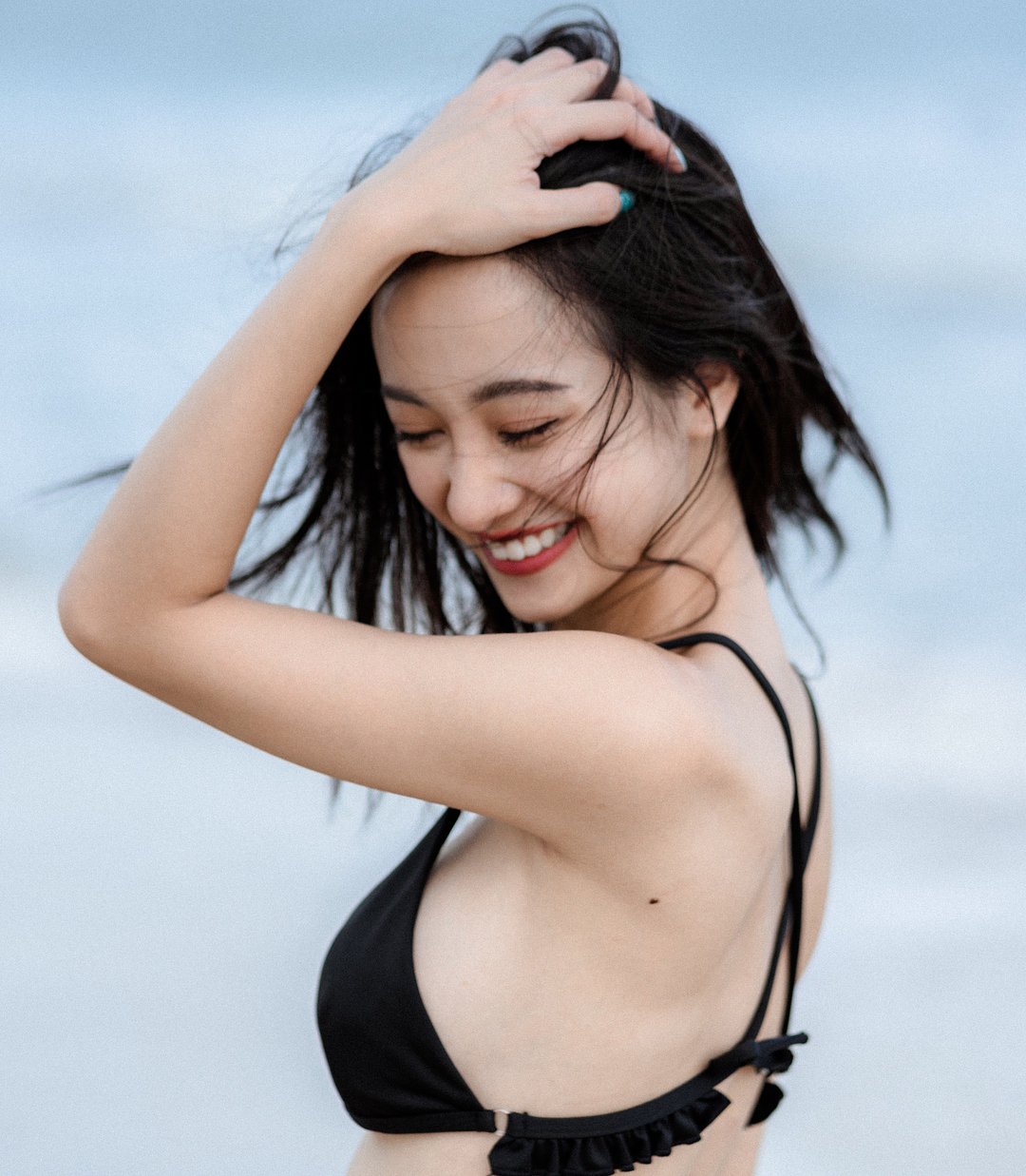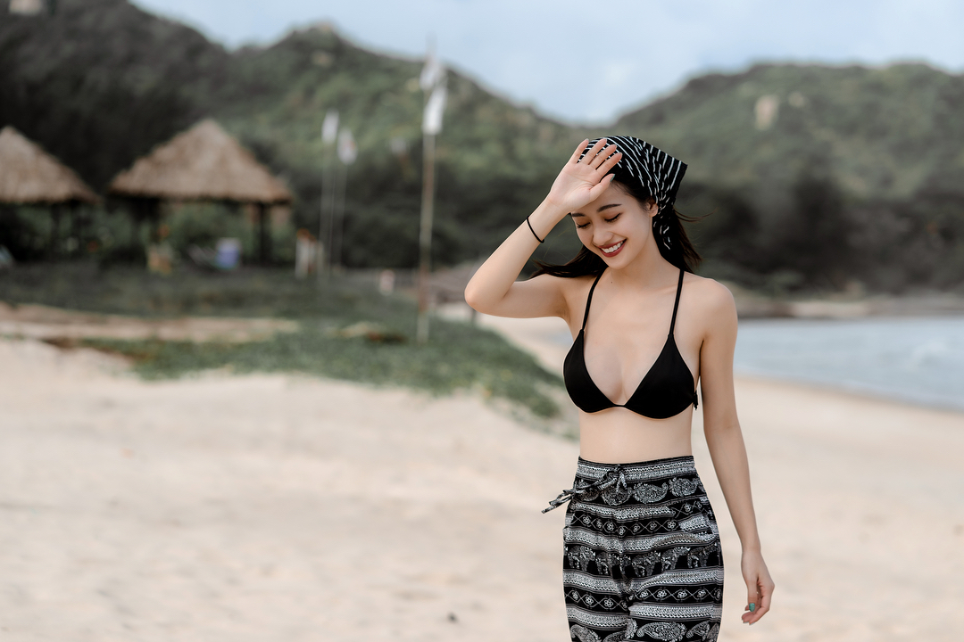 Diện trang phục bikini đen, nữ diễn viên khoe nụ cưởi tỏa nắng trên biển.