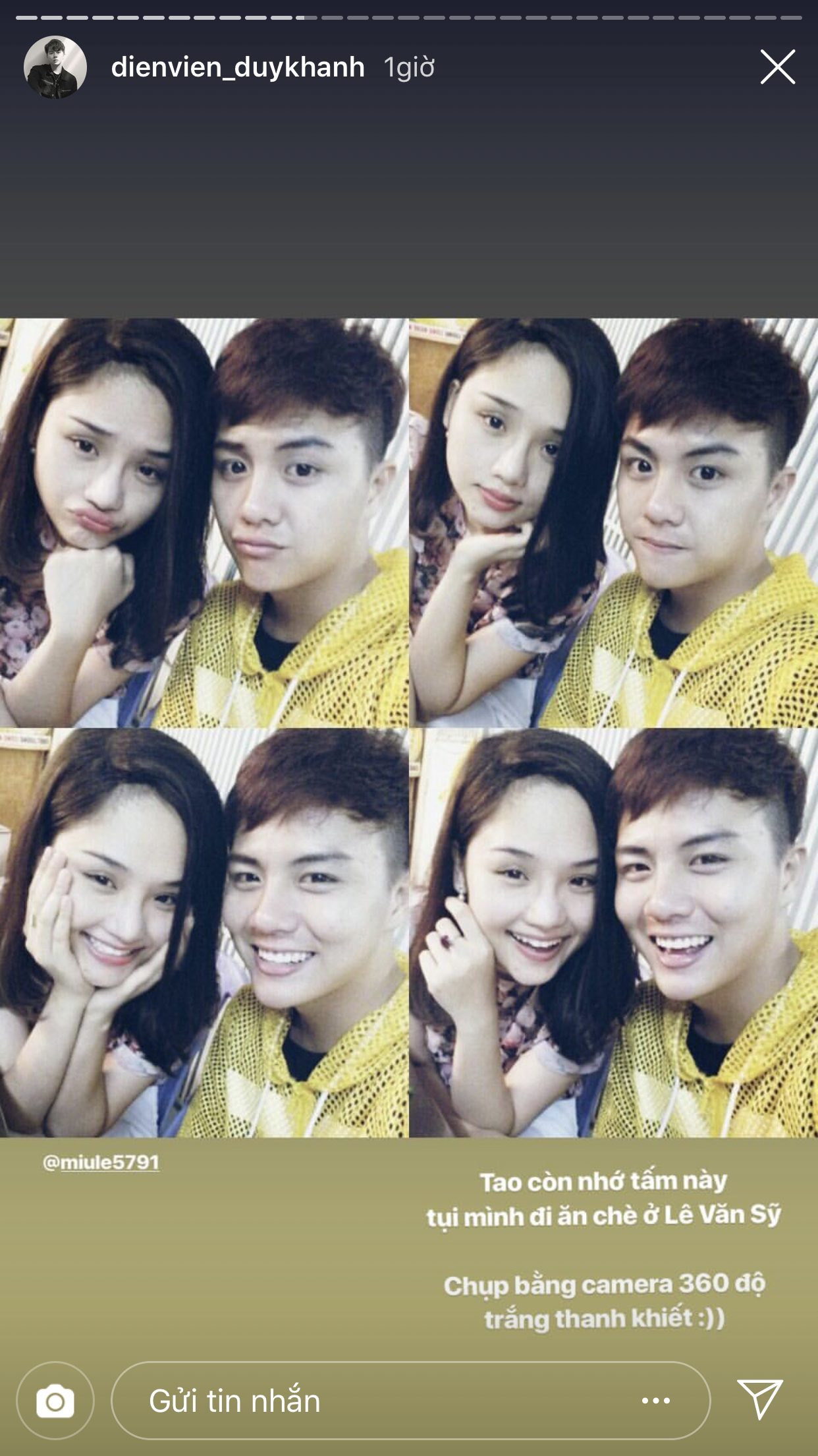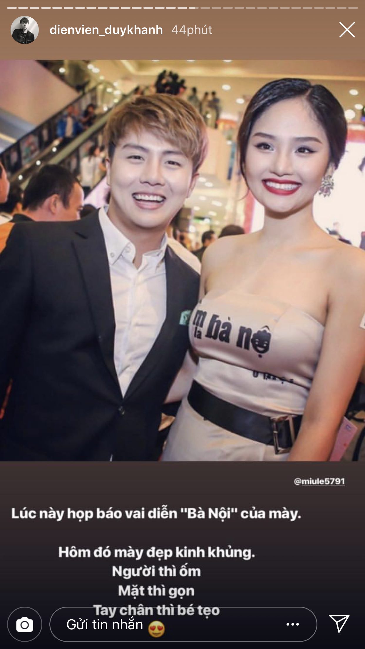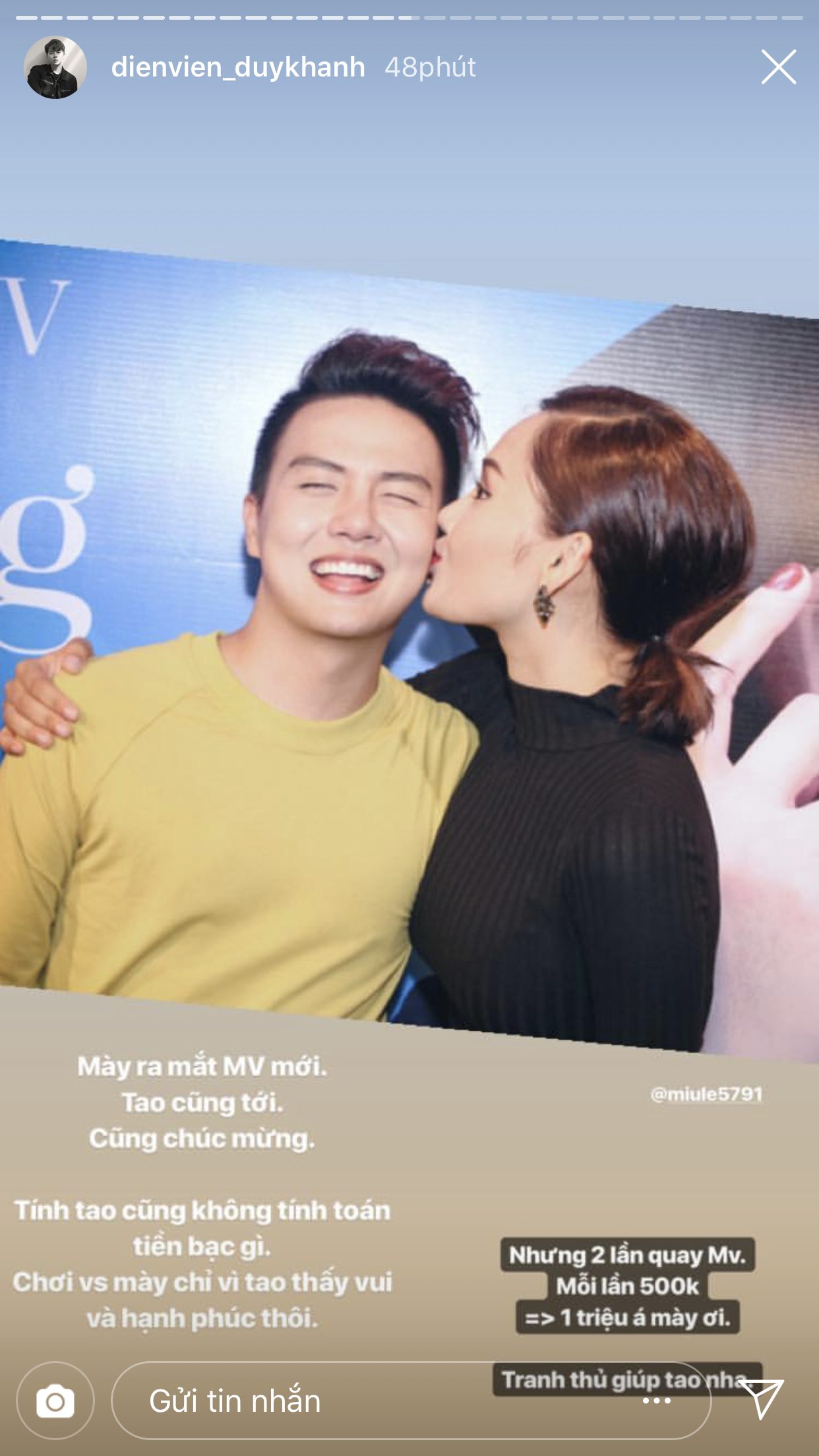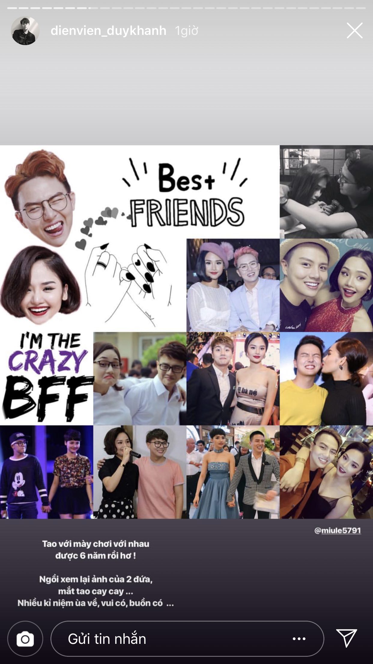 Trước thềm đến ngày tình bạn của cả hai tròn 6 tuổi, Duy Khánh đã đăng rất nhiều story để chia sẻ lại những câu chuyện từ thuở mới bắt đầu quen biết nhau và cũng nhờ vậy mà khán giả mới có cơ hội được biết thêm về độ sâu sắc của tình cảm giữa hai người. Duy Khánh chia sẻ, lúc mới bắt đầu làm bạn, anh chàng chỉ mới là diễn viên ở một sân khấu kịch, còn Miu Lê lúc này đã là một ca sĩ nổi tiếng. Dù vậy, cô nàng vẫn đến xem và ủng hộ cho “thằng bạn” của mình. Điều này đã khiến cho Duy Khánh xúc động và cảm thấy tự hào vì có được một người bạn như Miu Lê.