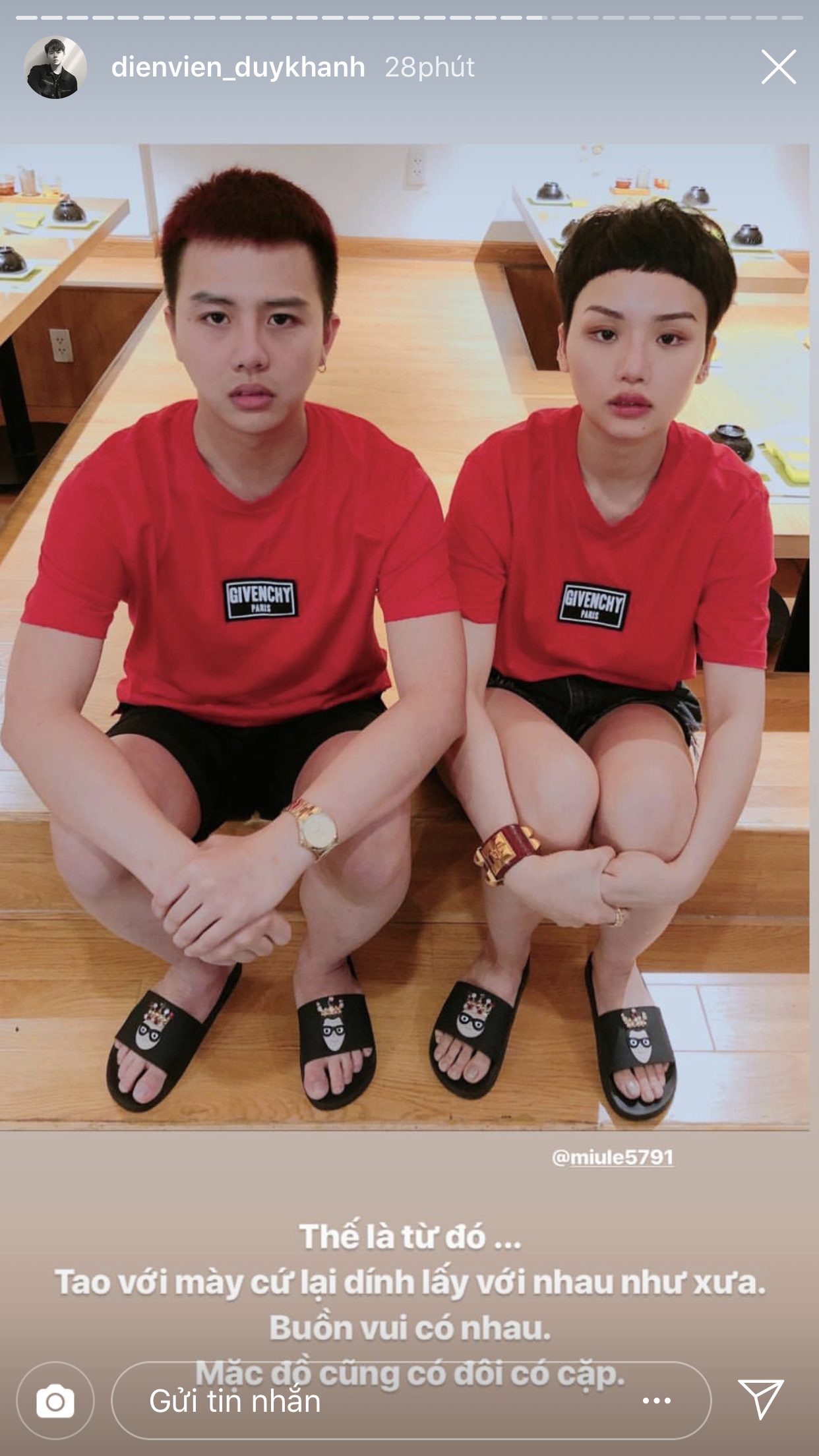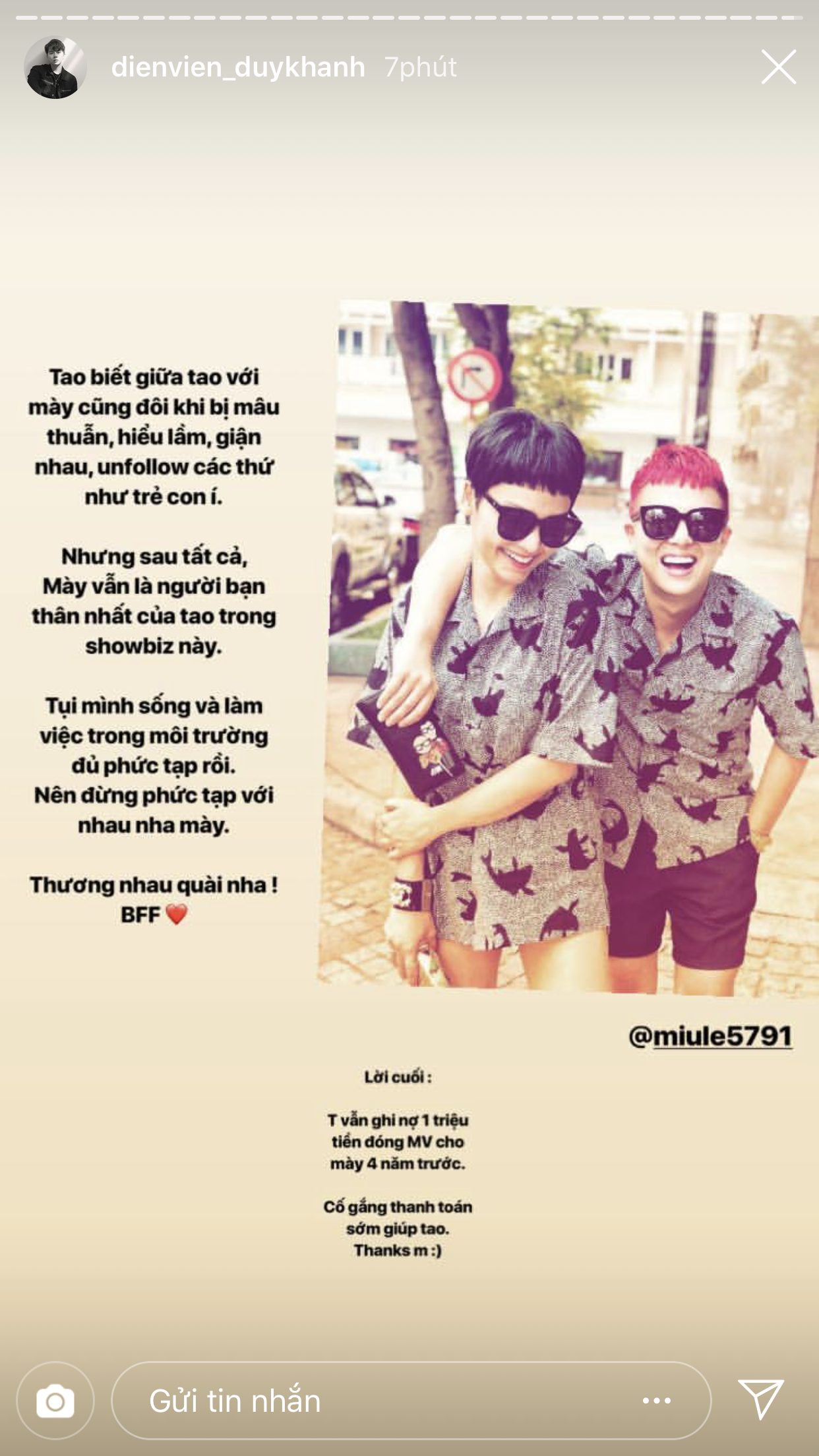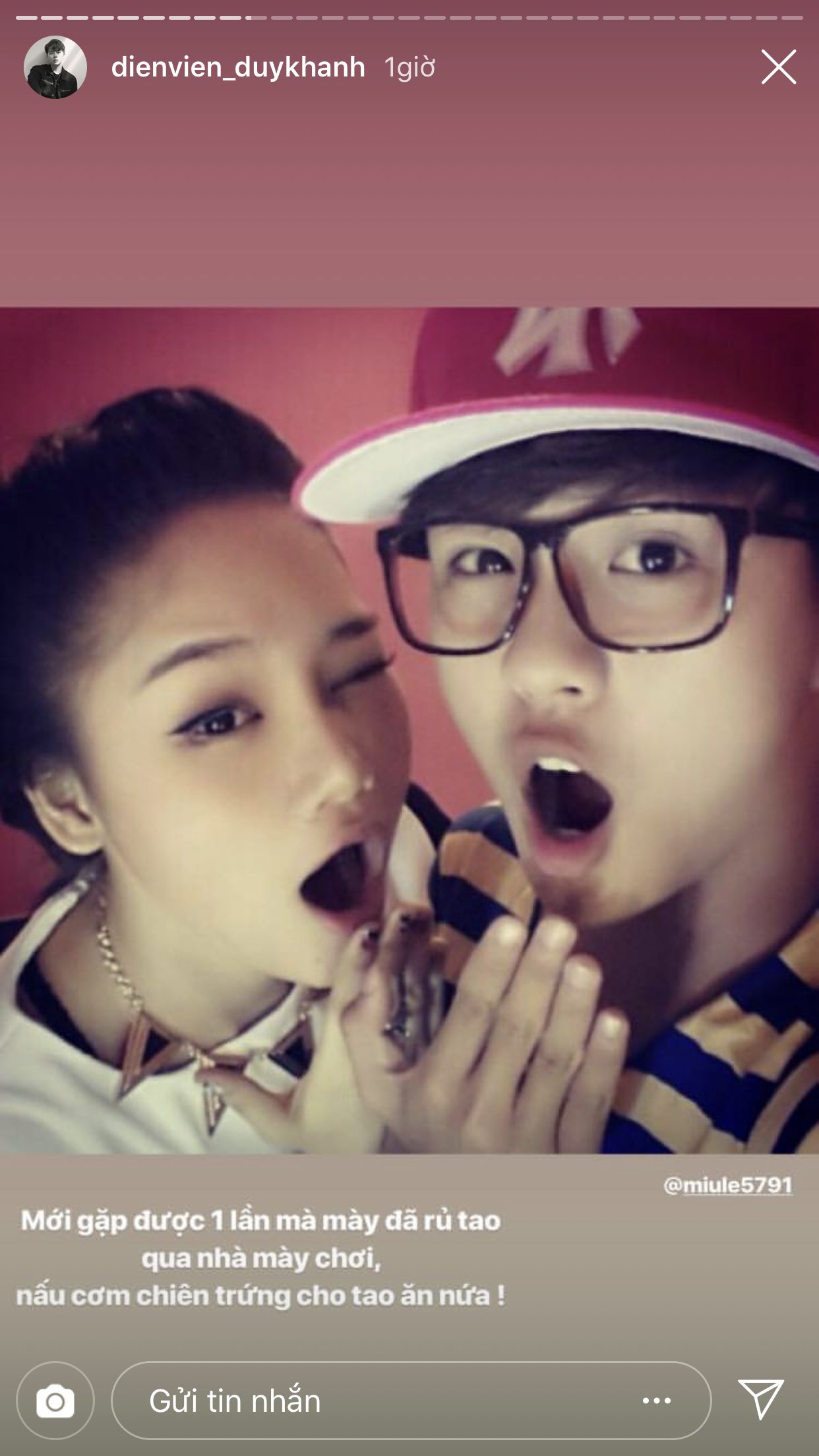 Trước thềm đến ngày tình bạn của cả hai tròn 6 tuổi, Duy Khánh đã đăng rất nhiều story để chia sẻ lại những câu chuyện từ thuở mới bắt đầu quen biết nhau và cũng nhờ vậy mà khán giả mới có cơ hội được biết thêm về độ sâu sắc của tình cảm giữa hai người. Duy Khánh chia sẻ, lúc mới bắt đầu làm bạn, anh chàng chỉ mới là diễn viên ở một sân khấu kịch, còn Miu Lê lúc này đã là một ca sĩ nổi tiếng. Dù vậy, cô nàng vẫn đến xem và ủng hộ cho “thằng bạn” của mình. Điều này đã khiến cho Duy Khánh xúc động và cảm thấy tự hào vì có được một người bạn như Miu Lê.