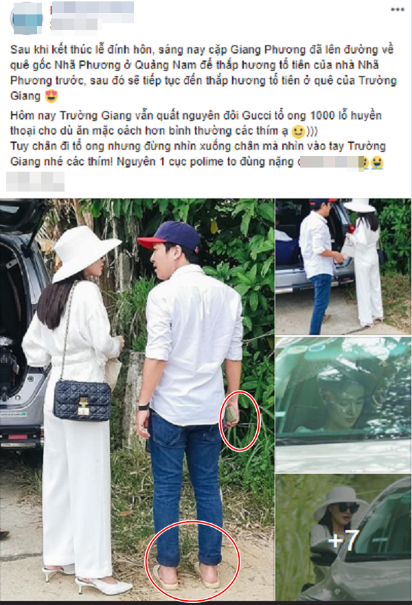 Một trong những điểm khá thú vị được cộng đồng mạng nhanh mắt phát hiện ra đó chính là nam danh hài đi một đôi dép tổ ong khi về quê vợ. Không những thế, vật trên tay Trường Giang khi bước xuống xe cũng được cư dân mạng nhanh tay phát hiện.