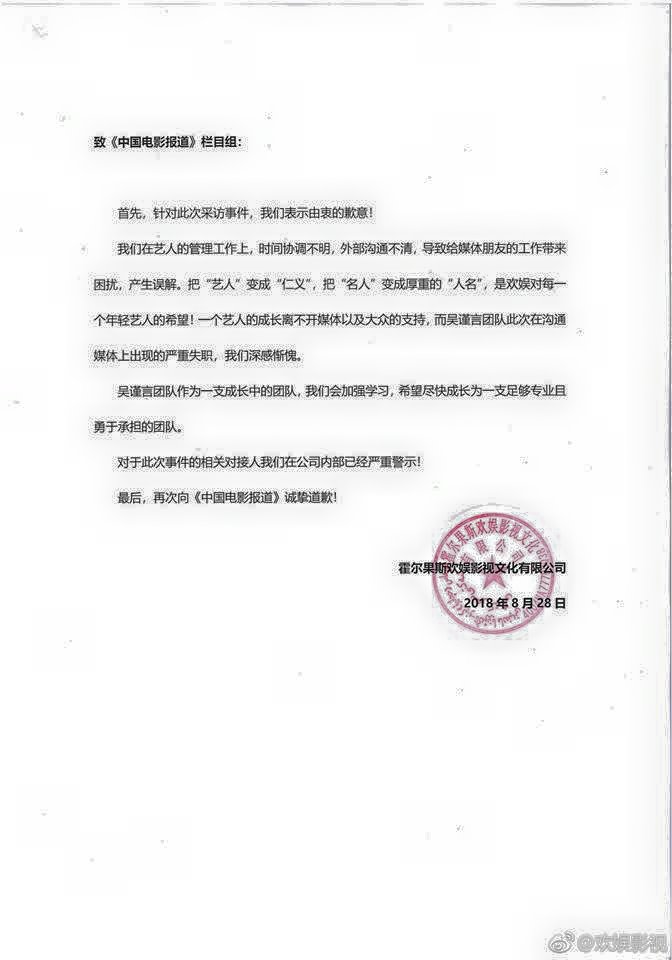 Ngô Cẩn Ngôn gửi lời xin lỗi đến tờ Điện Ảnh Trung Quốc và công chúng.