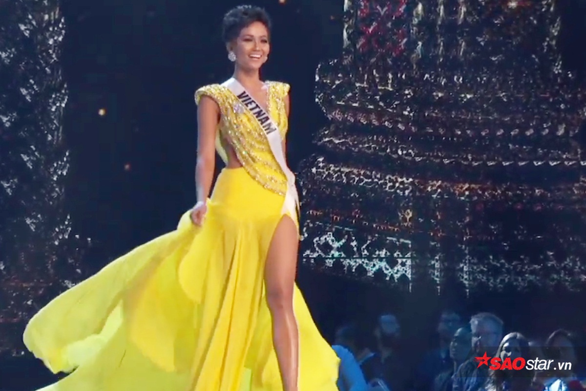 Và thật sự ấn tượng khi H’Hen Niê lựa chọn bộ trang phục màu vàng với 2 vạt xéo và xẻ tà phần thân chính là bộ trang phục được đại diện Việt Nam lựa chọn. Phần cut-out eo khéo léo giúp H’Hen Niê “hứng trọn” mọi ánh nhìn. Với màu vàng cực nổi bật, dường như trên sàn diễn bán kết Miss Universe 2018, H’Hen Niê chính là một vàng sáng nổi bật nhất.