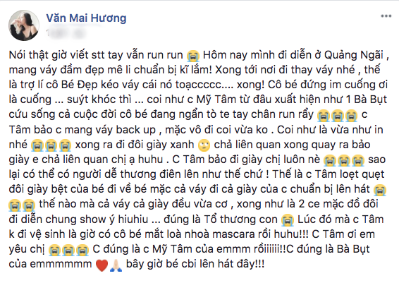 Đang “mếu máo”, run rẩy và loay hoay chưa tìm được cách xử lý thì lúc này Mỹ Tâm xuất hiện như một “cô Tiên”, không ngần ngại đưa trang phục và giày dự phòng cho đàn em. Hành động này khiến Văn Mai Hương hết sức cảm kích, cô viết: “Chị Tâm ơi, em yêu chị, chị đúng là vị cứu tinh của em rồi! Đúng là bà bụt của em”.