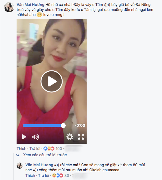Khi chia sẻ sự việc với fan, Văn Mai Hương không quên quay lại clip diện bộ cánh đỏ Mỹ Tâm cho mượn với thần thái phấn khích. Cô cho biết sẽ mang váy về giặt sạch, xịt nước hoa mới đem trả “nếu không FC chị Tâm lại mang rau muống đến thì ngại lắm”.