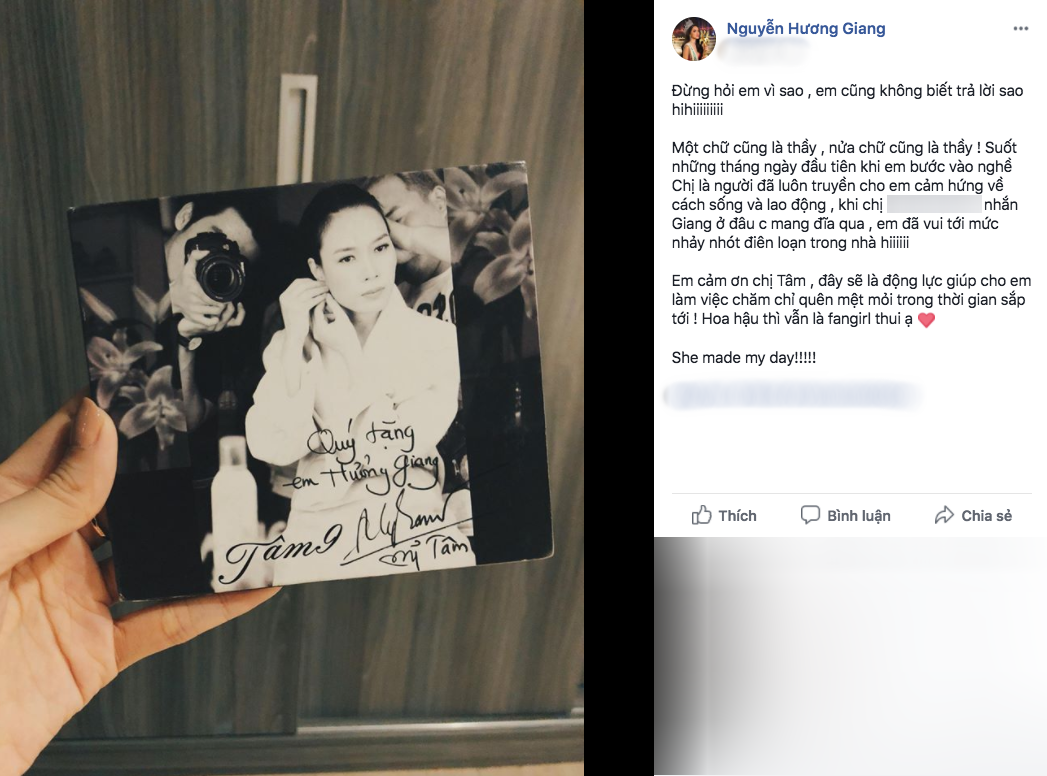 “Đừng hỏi em vì sao, em cũng không biết trả lời sao. Một chữ cũng là thầy, nửa chữ cũng là thầy. Suốt những ngày tháng đầu tiên khi em bước vào nghề, chị là người đã luôn truyền cảm hứng cho em về cuộc sống và lao động. Em vui tới mức nhảy nhót điên loạn trong nhà hi hi. Em cảm ơn chị Tâm, đây sẽ là động lực giúp cho em làm việc chăm chỉ quên mệt mỏi trong thời gian sắp tới! Hoa hậu thì vẫn là fangirl thôi ạ” - cô viết.