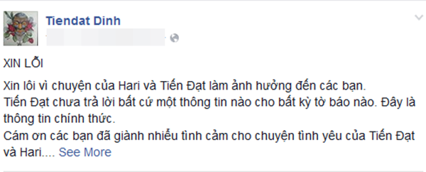 Khi mọi “mũi giáo dư luận” chĩa về phía Hari, Tiến Đạt đích thân lên tiếng xin lỗi và nhận về bản thân mọi lỗi lầm. Anh cho rằng trong chuyện này, anh là người có lỗi khi không thể thực hiện được những lời hứa của mình: “Cám ơn các bạn đã dành nhiều tình cảm cho chuyện tình yêu của Tiến Đạt và Hari. Chuyện gì đến sẽ đến, lỗi là do Tiến Đạt không giữ được lời hứa của mình. Ban đầu tưởng chừng như việc này rất đơn giản nhưng thật sự nó không hề đơn giản như mình nghĩ. Chính điều đó đã làm cho Hari và Tiến Đạt hay buồn và tranh cãi“. Anh còn khẳng định: “Chúng tôi phải xa nhau, vì lỗi là do tôi“.