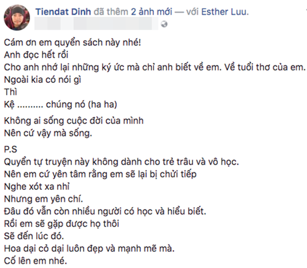 Một lần nữa, giữa làn sóng dư luận, Tiến Đạt lên tiếng bảo vệ Hari Won. Thông qua trang facebook cá nhân, anh đăng tải hình ảnh quyển tự truyện và gửi lời nhắn nhủ đến Hari: “Cám ơn em quyển sách này nhé! Anh đọc hết rồi. Cho anh nhớ lại những ký ức mà chỉ anh biết về em. Về tuổi thơ của em“. Anh còn không quên dặn dò, động viên: “Hoa dại, cỏ dại luôn đẹp và mạnh mẽ mà. Cố lên em nhé!”