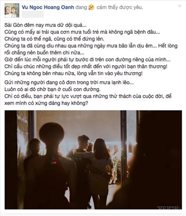 Sau đó, Hoành Oanh cũng trải lòng về vấn đề này. Nữ diễn viên Tháng năm rực rỡ đăng tải hình ảnh cả hai bên nhau cùng dòng trạng thái đầy tâm trạng nhưng vô cùng tích cực. Không trực tiếp nêu rõ nguyên do cũng không nhắc đến tên người cũ nhưng bằng sự khéo léo, mọi người có thể hiểu được những điều cô chia sẻ.
