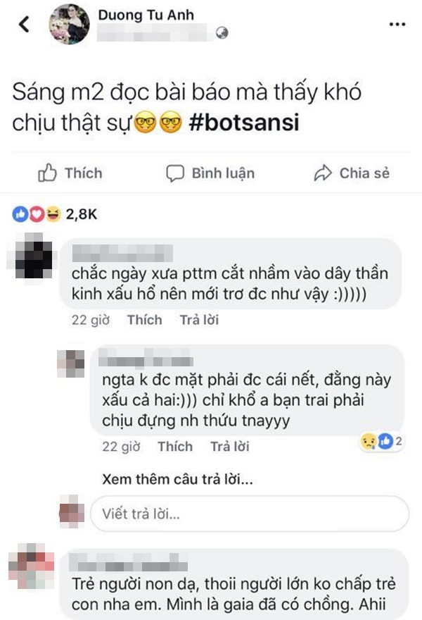 Dòng trạng thái của Tú Anh được cho rằng ám chỉ người yêu cũ của vị hôn phu. Cô bày tỏ sự bức xúc cho chồng tương lai khi đã có khoảng thời gian dài chịu đựng “người ấy”.