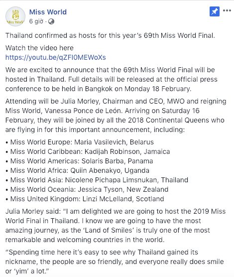 Miss World - Hoa hậu Thế giới 2019 sẽ được diễn ra tại xứ sở chùa vàng Thái Lan theo như thông tin được đăng tải trên trang chủ chính thức của cuộc thi. Theo đó, buổi họp báo lần đầu tiên sẽ diễn ra vào ngày 16/2 tới đây để công bố và ký kết giữa BTC Miss World và phía chủ nhà Thái Lan. Có lẽ, sau khâu tổ chức thành công vang dội của Miss Universe 2018, Thái Lan rất được khán giả trên thế giới đồng tình khi đăng cai Hoa hậu Thế giới năm nay.