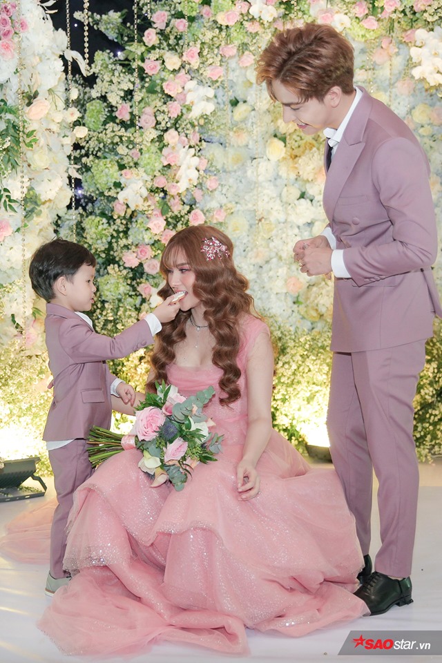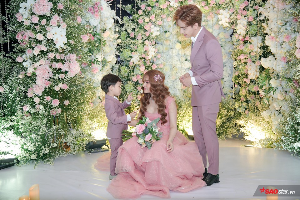 Con trai của Thu Thuỷ cũng xuất hiện trong lễ cưới. Cậu bé trông thật bảnh bao khi đứng cạnh mẹ và bố. Cậu nhóc Henry cũng được bố mẹ diện cho bộ cánh “tiệp màu” với trang phục cô dâu chú rể.