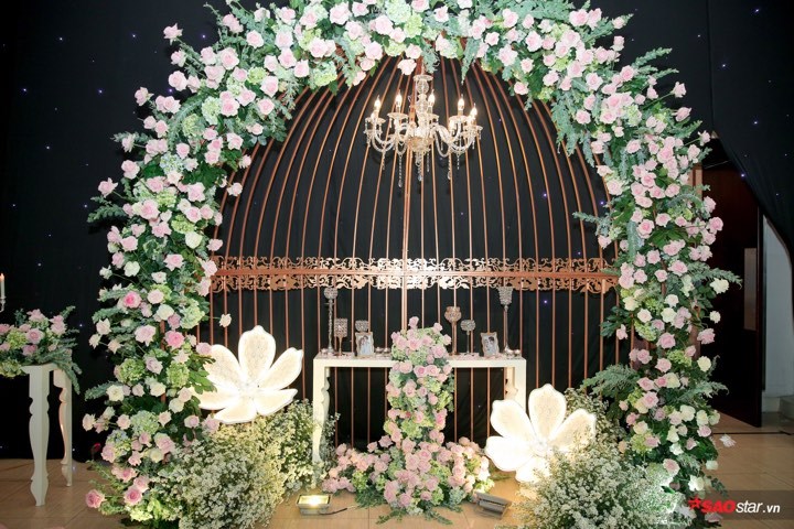 Không gian tiệc cưới vô cùng sang trọng với điểm nhấn là toàn bộ hoa tươi được chuyển từ Đà Lạt về. Khác với những đám cưới khác, đám cưới của Thu Thuỷ và Kin Nguyễn được lựa chọn tone màu hồng khá bắt mắt. Cô dâu và chú rể cũng lựa chọn trang phục với tone sur tone với màu trang trí lễ cưới.