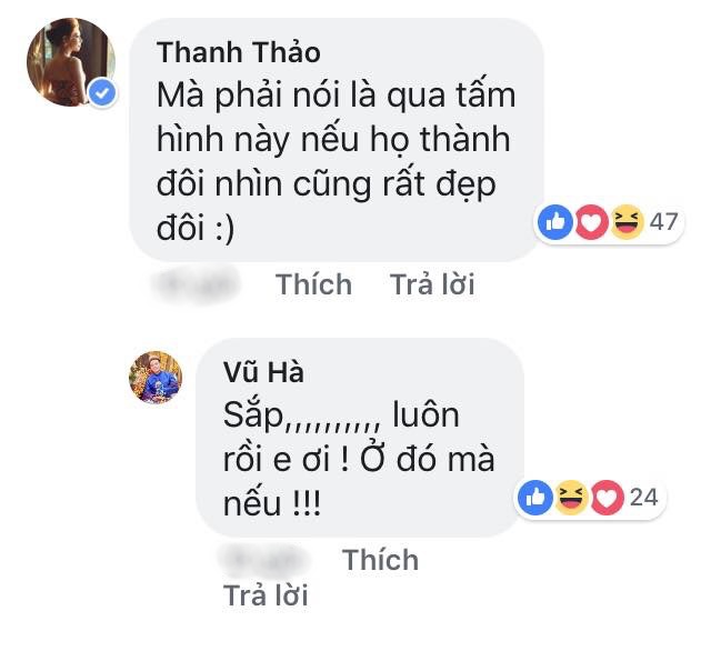 Chính vì vậy, mới đây, người hâm mộ không khỏi bất ngờ khi Vũ Hà “nửa đùa nửa thật” tiết lộ về đám cưới của Mr Đàm và Mỹ Tâm. Cụ thể, dưới một bài đăng ghép ảnh hai ngôi sao kỳ cựu của V-biz trong trang phục cô dâu chú rể, Thanh Thảo hào hứng bình luận: “Qua tấm hình này nếu họ thành đôi nhìn cũng rất đẹp”. Phản hồi Thanh Thảo, Vũ Hà “gây sốt” khi thông báo: “Sắp… luôn rồi em ơi! Ở đó mà nếu!”.