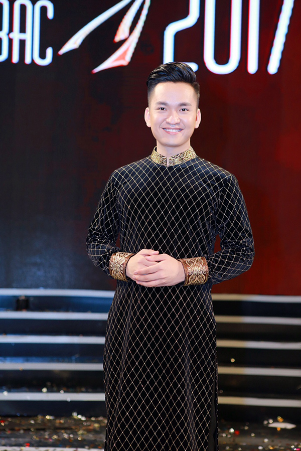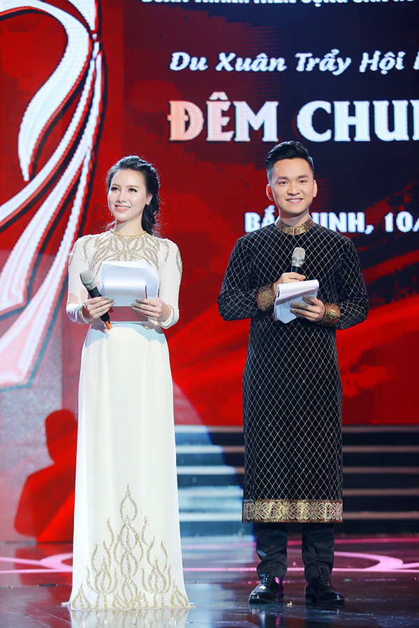 MC Hạnh Phúc diện áo dài của NTK Nhật Dũng với hoạ tiết được thiết kế riêng, mang nhiều nét đặc trưng của đất Bắc.
