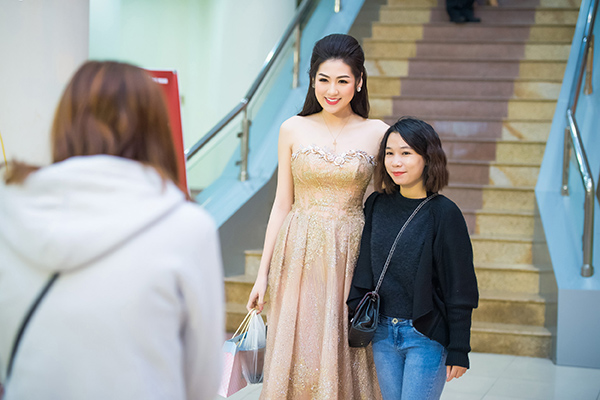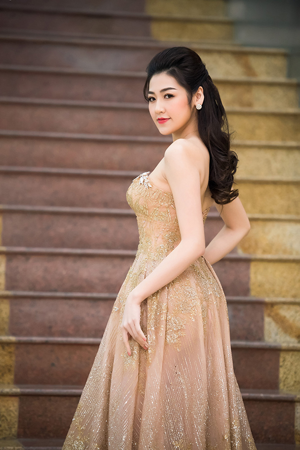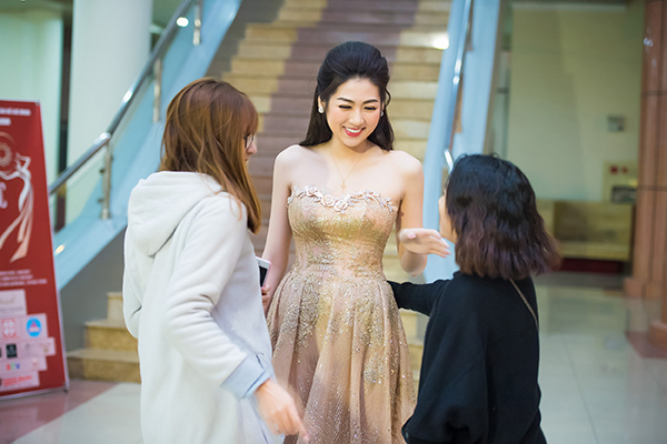 Khoác lên mình bộ trang phục dạ hội màu vàng đồng của NTK Thùy Victory để làm nổi bật nhan sắc kiêu sa và làn da trắng của Á hậu. Đặc biệt, Tú Anh còn không ngần ngại khoe vòng một quyến rũ cùng bờ vai gợi cảm giữa trời giá lạnh.
