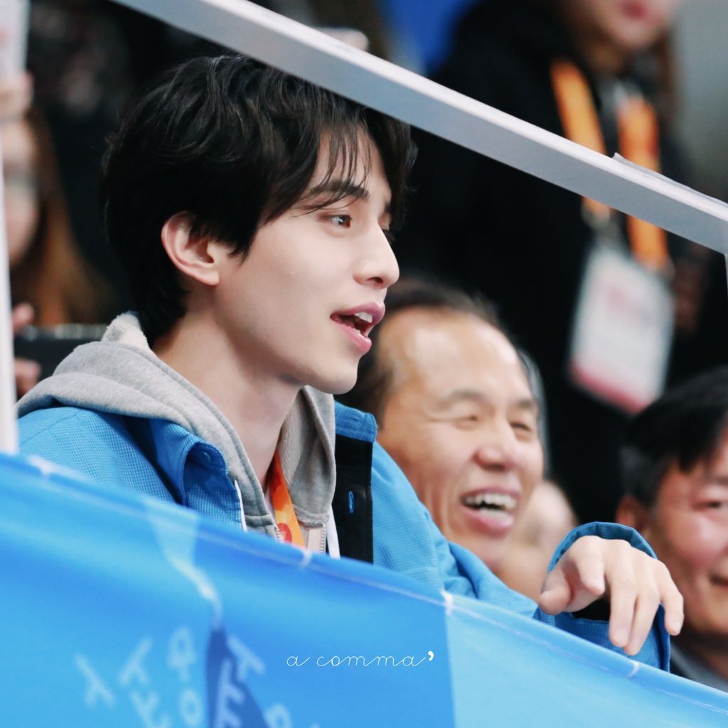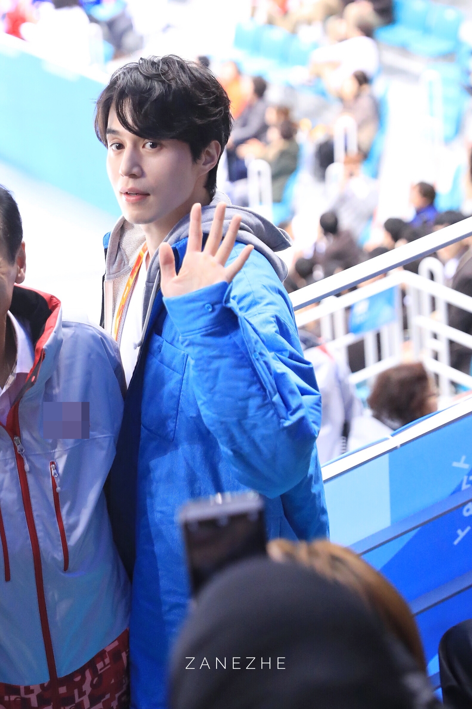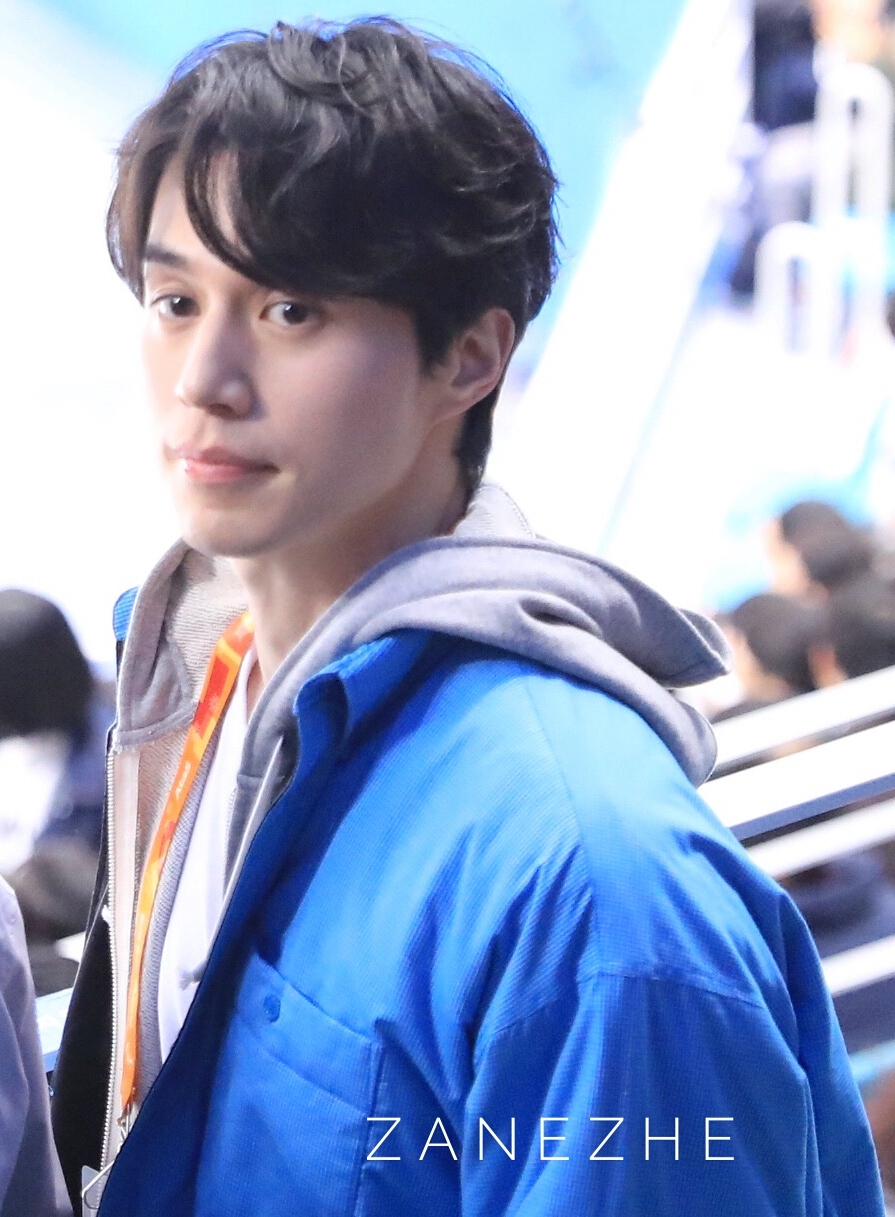 Lee Dong Wook điển trai trên hàng ghế cổ vũ tại Thế vận hội mùa đông.