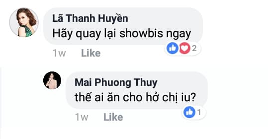 Cách đây 1 tuần khi Mai Phương Thúy đi dự sự kiện Thank You Party của H'Hen và cô hoa hậu Việt Nam 2006 đã đăng những bức ảnh được chụp tại sự kiện lên trang cá nhân. Lã Huyền Thanh đã vào để lại comment kêu gọi Mai Phương Thúy quay trở lại với showbiz đi vì ngày càng đẹp và trẻ ra. Cô nàng đã có câu trả lời hết sức bất ngờ rằng: “Thế ai ăn cho hở chị iu?”.
