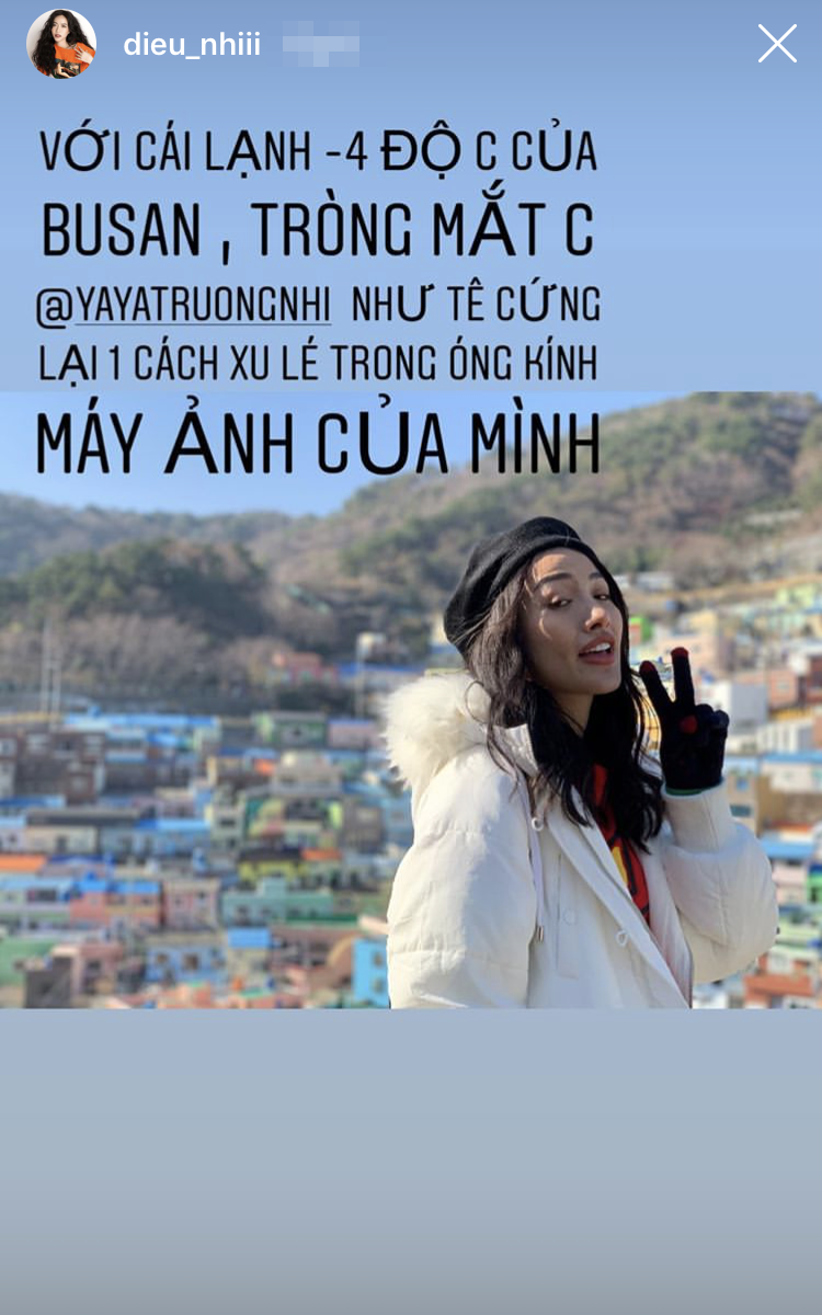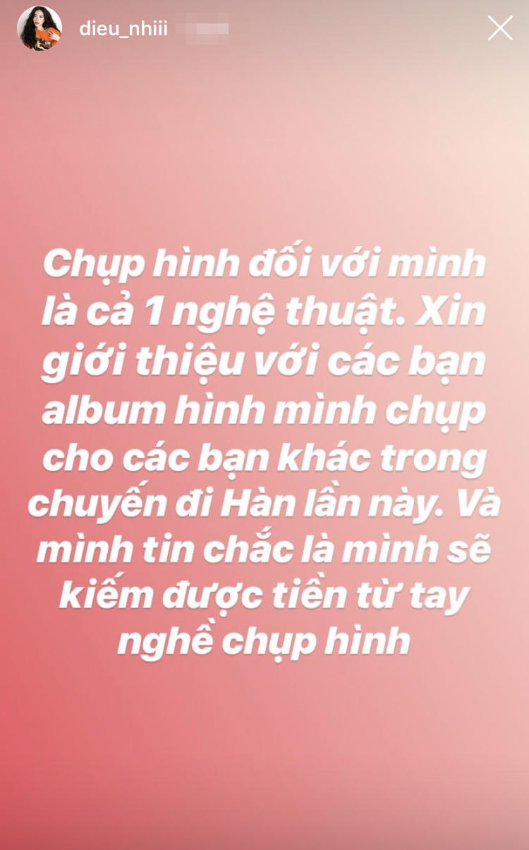 Mới đây trên trang Instagram cá nhân của mình, Diệu Nhi bất ngờ đăng tải dòng trạng thái bày tỏ sự quan tâm đặc biệt với bộ môn nhiếp ảnh: “Chụp hình đối với mình là cả 1 nghệ thuật. Xin giới thiệu với các bạn album hình mình chụp cho các bạn khác trong chuyến đi Hàn lần này. Và mình tin chắc là mình sẽ kiếm được tiền từ tay nghề chụp hình“.