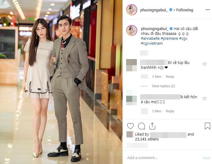 Phương Nga cũng đăng ảnh khoác tay người yêu ngọt ngào lên Instgram: “Hai cô cậu dắt nhau đi đâu thế?”.