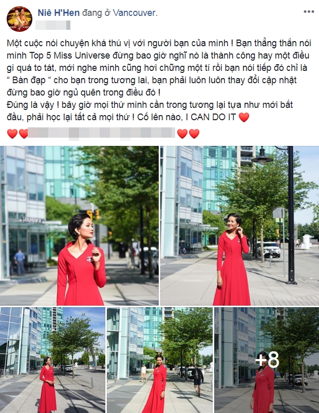 Mới đây, H'Hen Niê chia sẻ với các fan sự tiếc nuối khi không thể góp mặt trong đêm chung kết Hoa hậu Hoàn vũ Pueto Rico 2019 theo lời mời của cô bạn thân Kiara Ortega - Top 5 Miss Universe 2018. Người đẹp Ê Đê đang bận lịch trình công việc tại Canada và bất ngờ chia sẻ mình nhận được một lời khuyên thẳng thắn từ một người bạn về thành tích tuyệt vời trong năm qua: “Đừng bao giờ nghĩ Top 5 Miss Universe là thành công“.