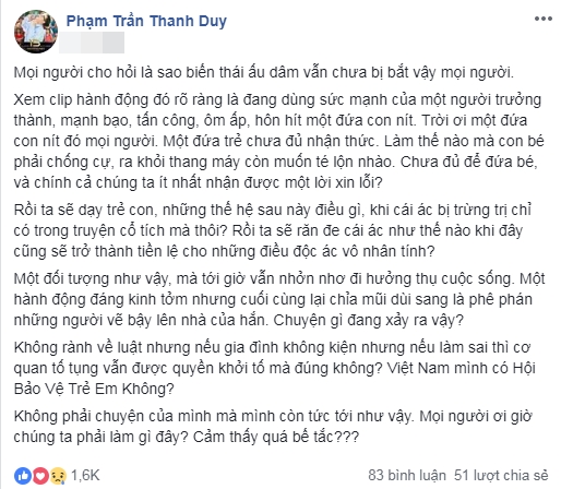 Trong hôm nay (16/4), ca sĩ Thanh Duy, ca nhạc sĩ Bùi Lan Hương cũng lên tiếng bày tỏ sự bức xúc về vụ việc người đàn ông hôn bé gái trong thang máy. Trước thông tin gia đình bé gái yêu cầu ngừng điều tra, các chuyên gia pháp lý do rằng vẫn có thể khởi tố khi đã có video trích xuất từ camera an ninh và lời khai của nhân chứng.