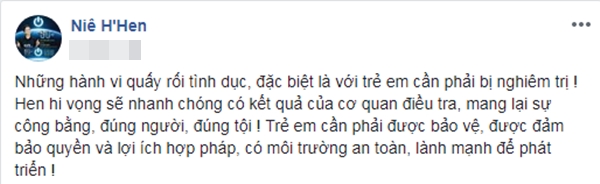 Trên trang cá nhân, hoa hậu H'Hen Niê chia sẻ: “Những hành vi quấy rối tình dục, đặc biệt là với trẻ em cần phải bị nghiêm trị. Hen hi vọng sẽ nhanh chóng có kết quả của cơ quan điều tra, mang lại sự công bằng, đúng người, đúng tội. Trẻ em cần phải được bảo vệ, được đảm bảo quyền và lợi ích hợp pháp, có môi trường an toàn, lành mạnh để phát triển”. Ngay lập tức nhiều bạn bè và người hâm mộ của người đẹp Ê Đê để lại bình luận ủng hộ và cũng không giấu được sự bức xúc, mong mỏi vụ việc sớm được điều tra rõ ràng.