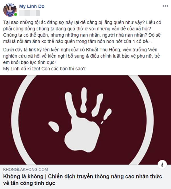 Thiết thực hơn, Hoa hậu Việt Nam 2016 - Đỗ Mỹ Linh chia sẻ đường link kêu gọi các fan góp chữ ký cho việc kiến nghị bổ sung và điều chỉnh luật bảo vệ phụ nữ, trẻ em khỏi bạo lực tình dục. Đây cũng là hành động cần thiết để có cơ sở xử lý tội phạm ấu dâm trong các vụ việc về sau cũng như góp phần nâng cao tính răn đe xã hội, giảm thiểu sổ lượng tội phạm ấu dâm.