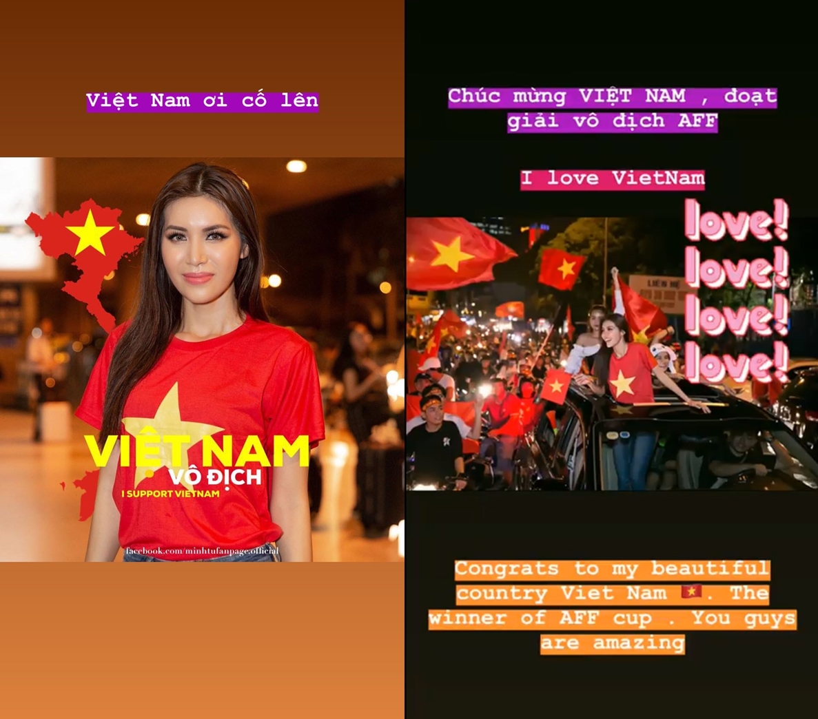 Đến cả Miss Earth Phương Khánh, Miss Supranational Asia Minh Tú lẫn H'Hen Niê đang chinh chiến Miss Universe tại Thái Lãn cũng vỡ òa cảm xúc vì chiến thắng mỹ mãn của đội tuyển AFF Việt Nam.