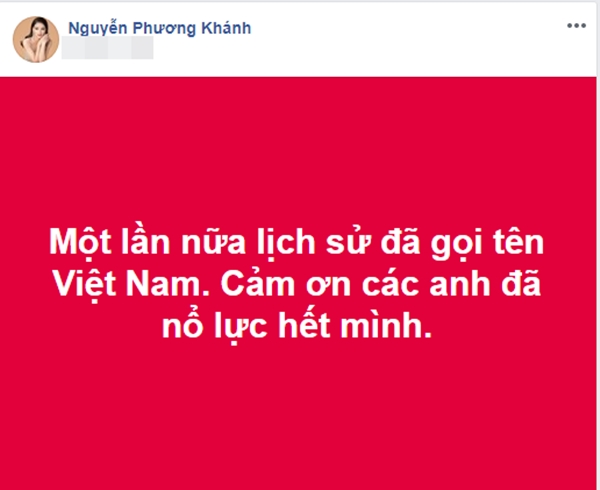 Tiểu Vy tự hào chia sẻ trên trang cá nhân: “Mấy anh ơi, thắng rồi. Cảm ơn các anh đã mang mùa xuân đến sớm. Bây giờ ai xuống đường thôi”.