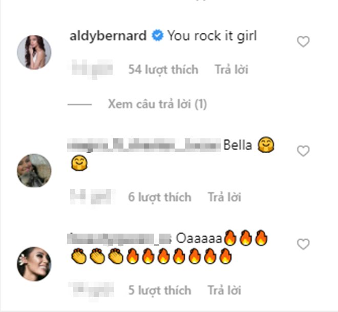 Aldy Bernard - Hoa hậu Cộng hòa Dominica thì ngạc nhiên “You rock it girl” (bạn là một cô nàng roker). Hoa hậu Hoàn vũ Nicaragua 2018 - Adriana Paniagua đánh giá rằng “Ôi trời ơi, bạn thực sự quá hoàn hảo đi”…