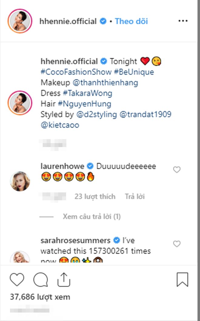 Sarah Rose Summers - Hoa hậu Mỹ 2018, cô nàng thân thiết với H’Hen Niê sau Miss Universe 2018 đã phải thốt lên: “I’ve watched this 157300261 times now” (Tôi đã xem hình ảnh của bạn 157300261 lần). Hoa hậu Hoàn vũ Canada thì phải thốt lên rằng “Tuyệt vời”.